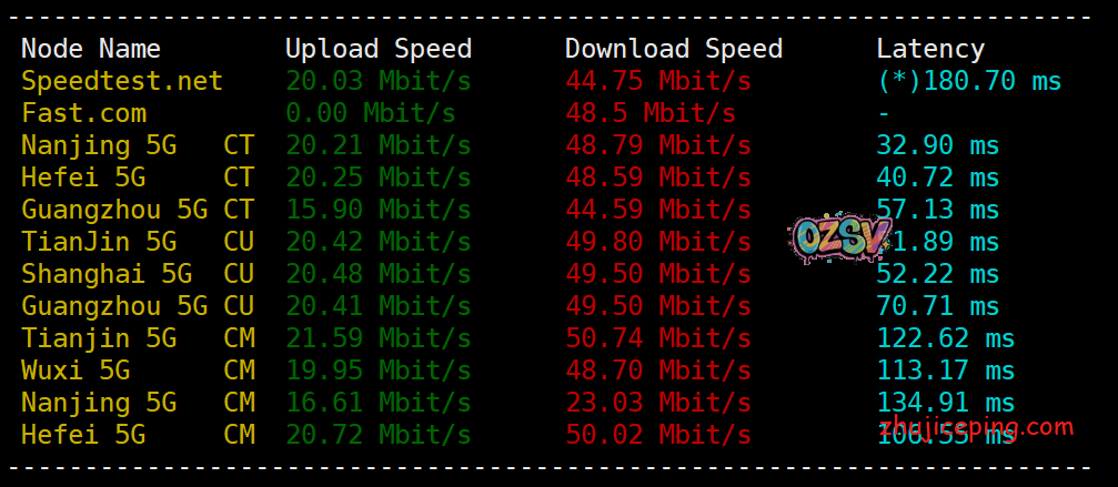 电信、联通、移动,国内三网的多个节点测试VPS的上行和下行带宽,基本上上行20Mbps可以跑满,官方给的下行是50Mbps:(如今官方全部免费升级到200~500M带宽了)
