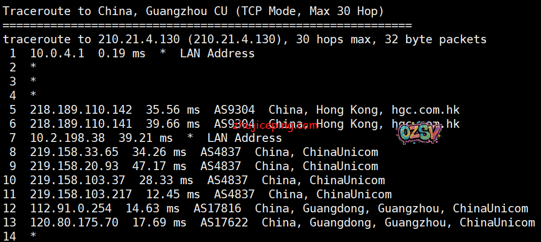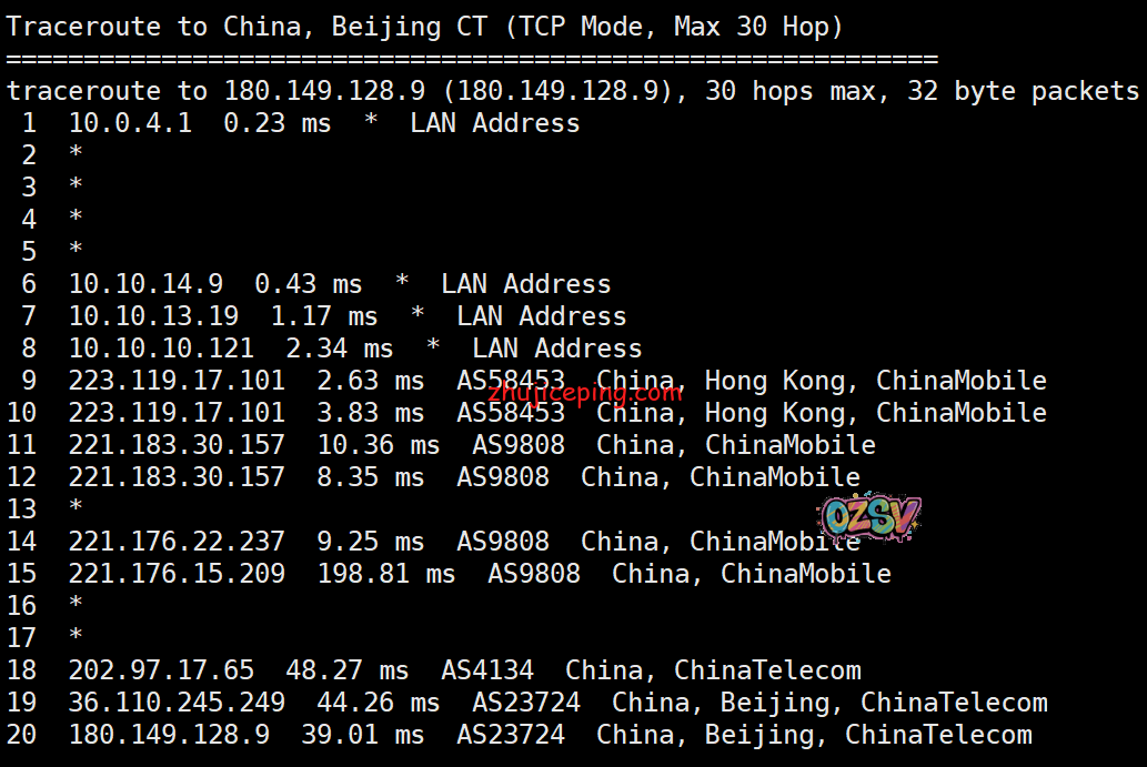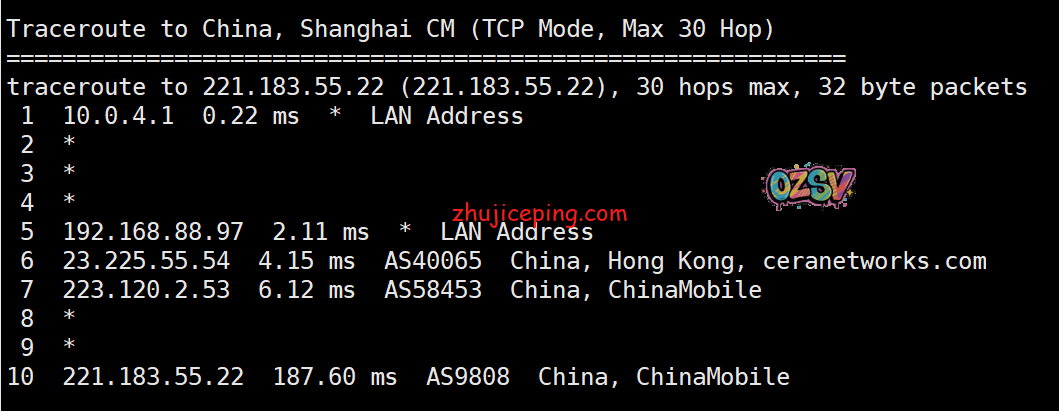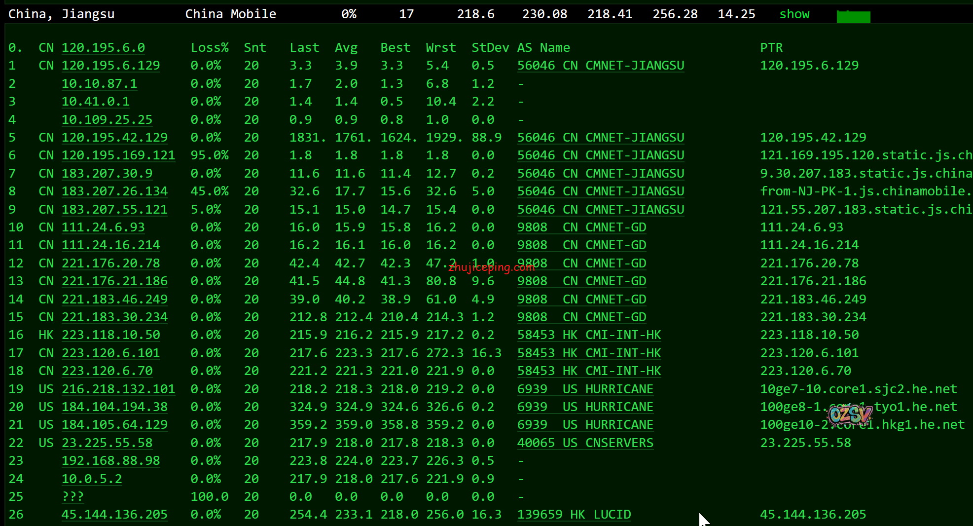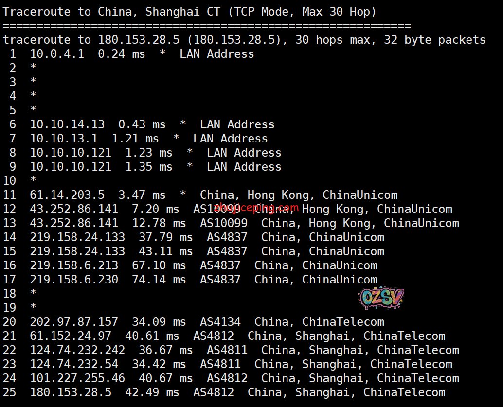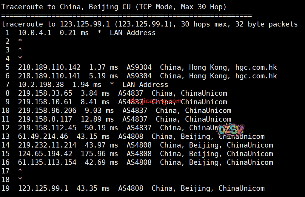 回程,到国内电信:上海、北京方向直连,广州方向走了CN2