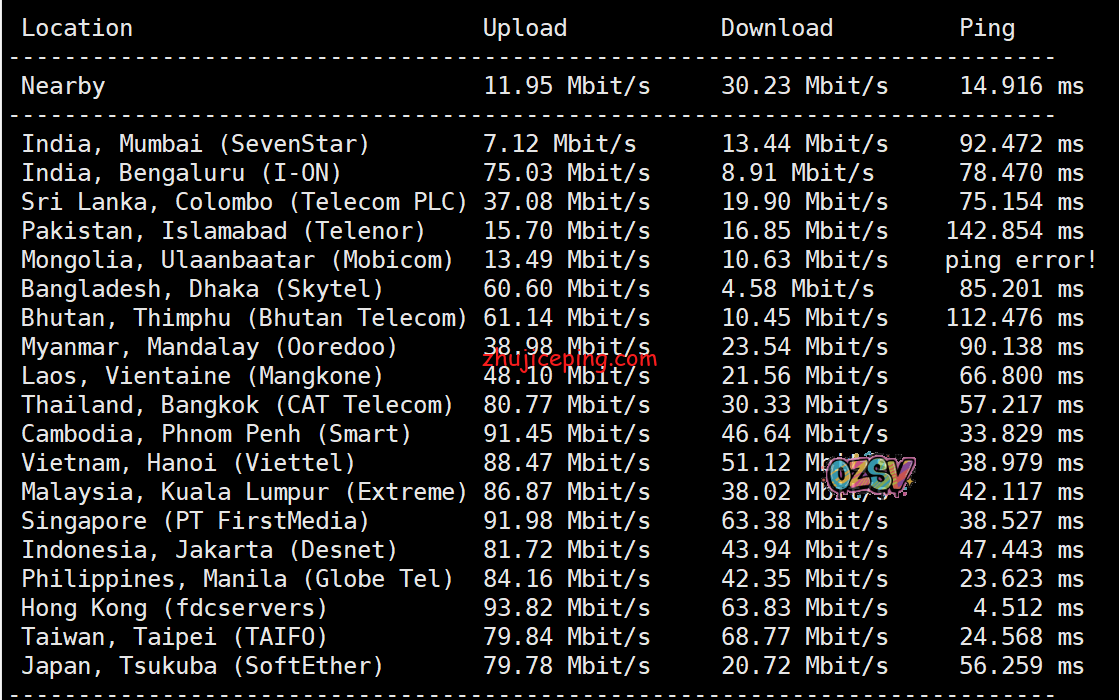 同样是speedtest,不过测试的是亚洲区域内的国家和地区,大家看看吧: