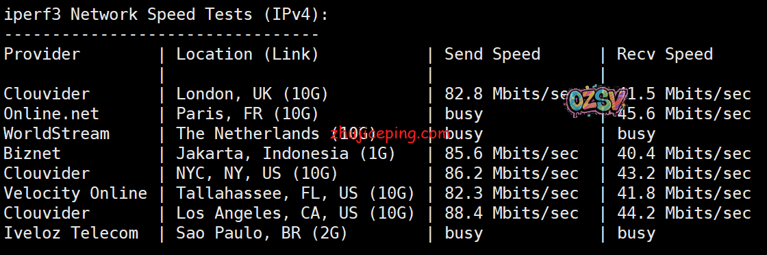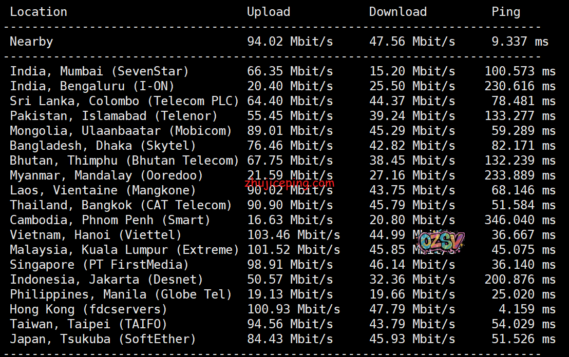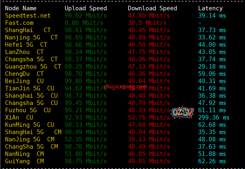 speedtest的国内三网节点显示我们最核心需要的上行带宽可以跑满,有了这个数据估计大家也比较放心了: