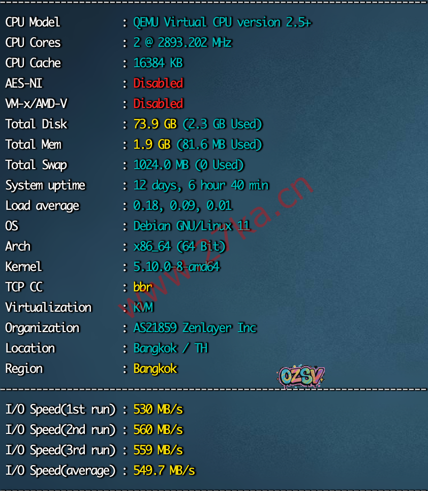 CPU型号未知,大致3.2GHz的主频,用的最低配2G内存这款做测评,开启了BBR,zenlayer自己的广播IP,硬盘I/O大致549MB/S的样子,大家熟悉下: