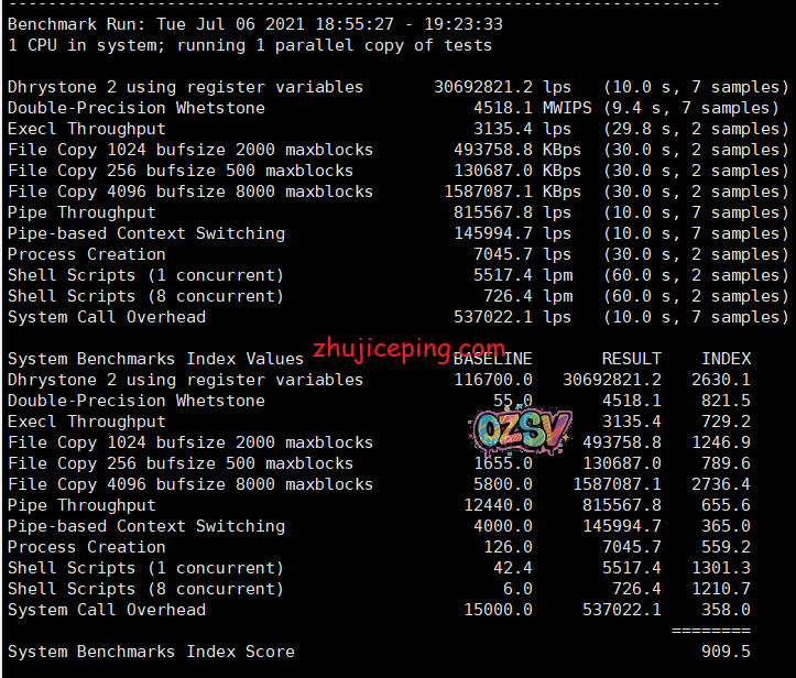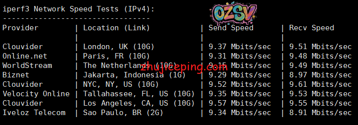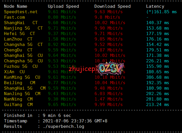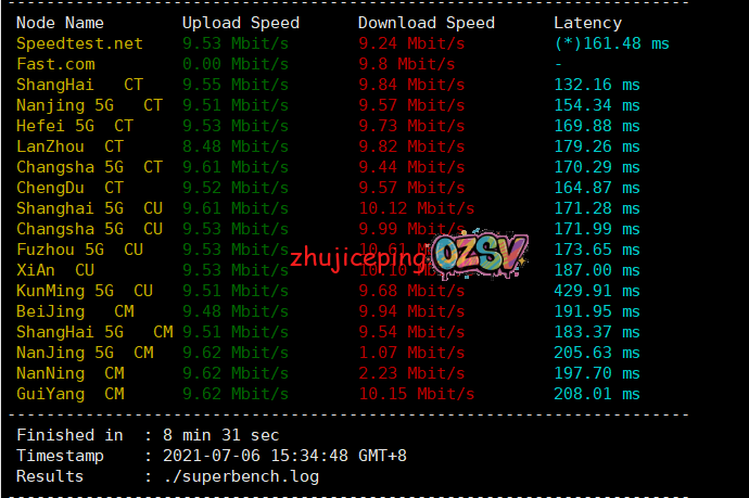 需要说明的是我们这个测试小鸡的购买的时候选择的是10Mbps,用speedtest.net提供的国内节点测试云服务器的上行带宽、下行带宽,尤其是上行带宽,基本上在9.5Mbps以上,带宽还是满足要求的:
