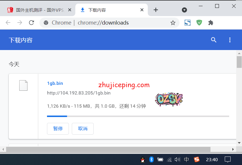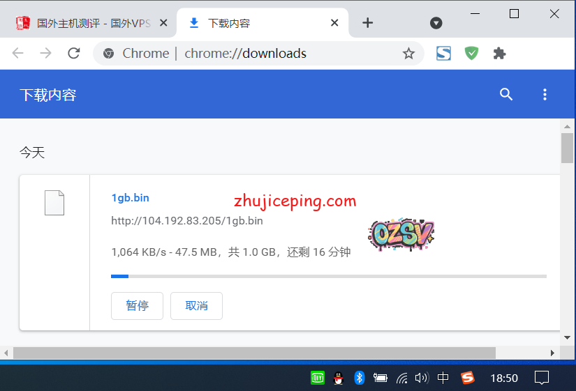 站长广州电信,用Chrome测试下载云服务器上的文件,速度在1064KB左右: