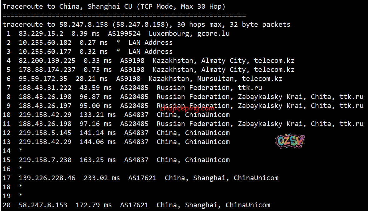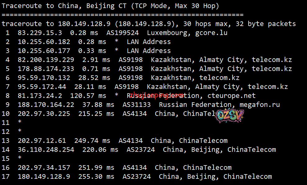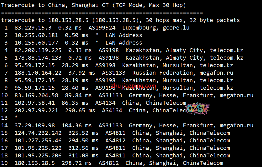 回程,到国内电信:回程基本上都是从俄罗斯过来,效果还比较可以