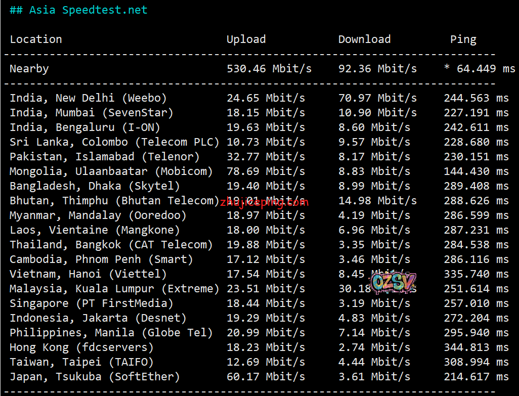 speedtest亚洲区域内的其他国家或者地区的效果如下: