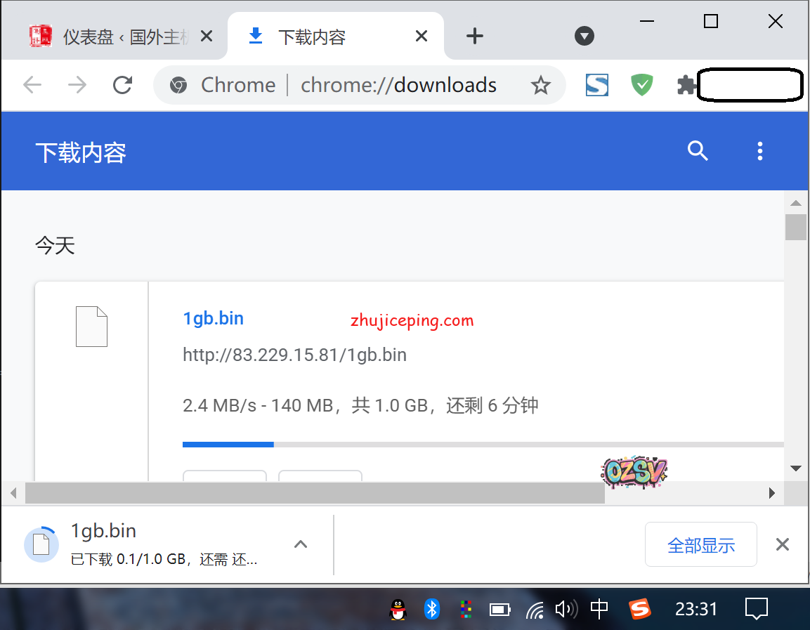 站长广州电信,Chrome浏览器下载测试机(云服务器)上的一个测速文件,晚上11点半的时候,下载速度2.4MB/S(19.2Mbps):