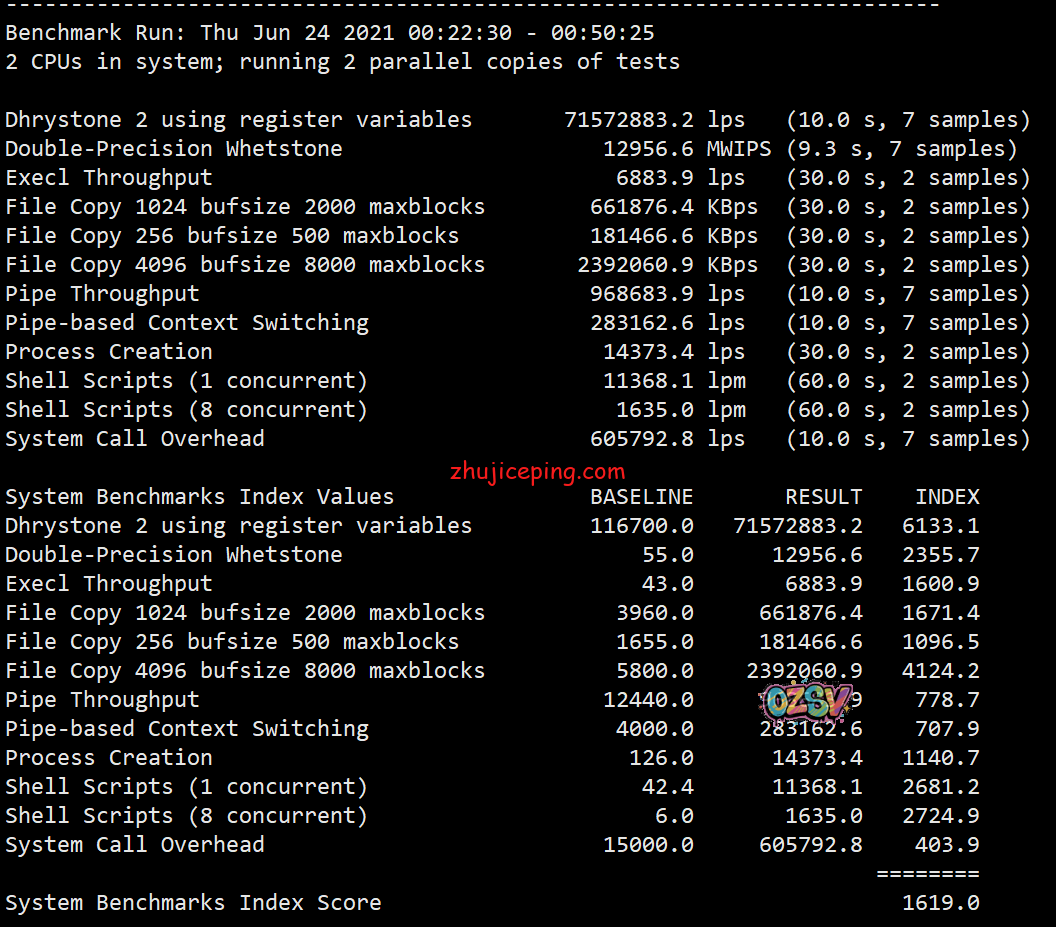 双核的云服务器,Unix bench Mark 1619,效果相对小母鸡VPS是比较一般的,不过在云服务器里面算是不错的了: