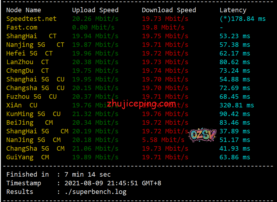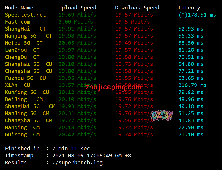 站长测试用的VPS官方写的是20Mbps带宽,用speedtest.net中国区节点测试下行和下行带宽,满足标注的20Mbps: