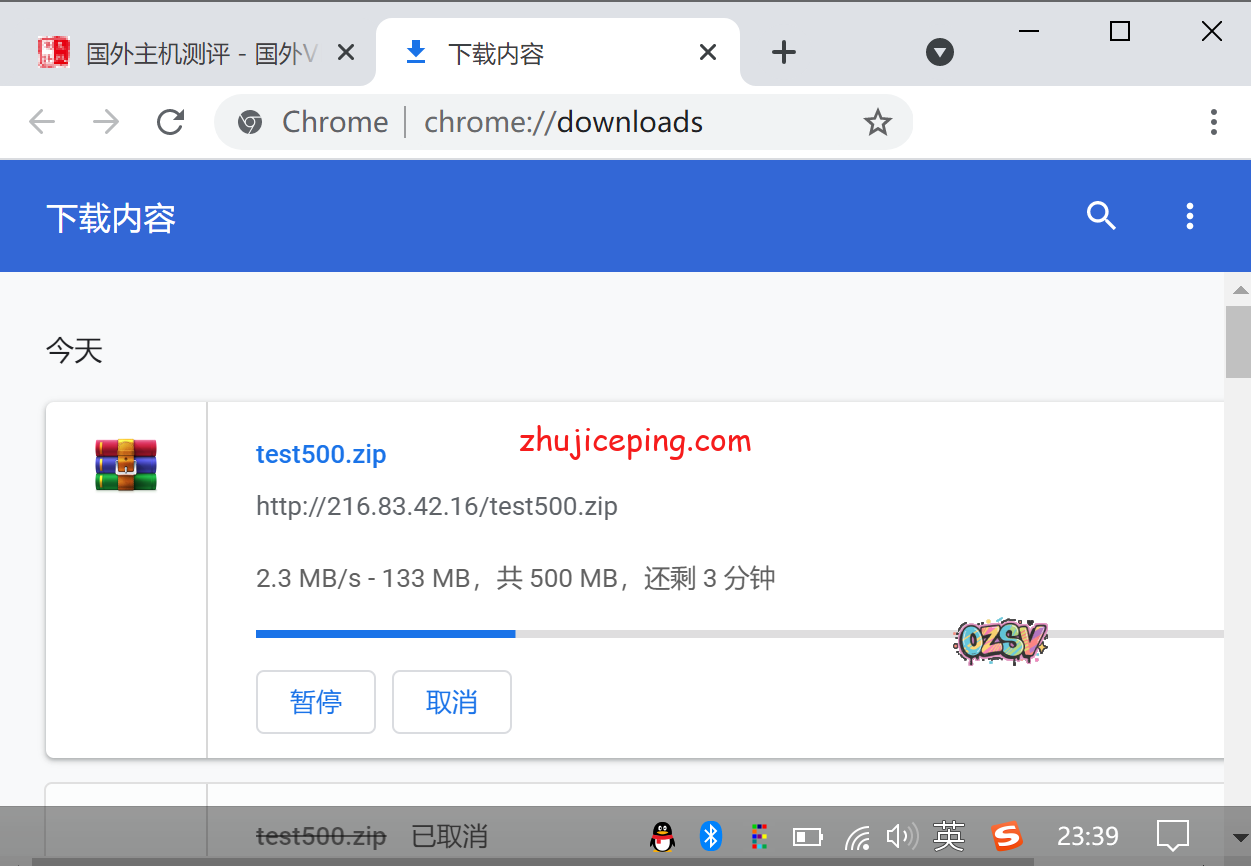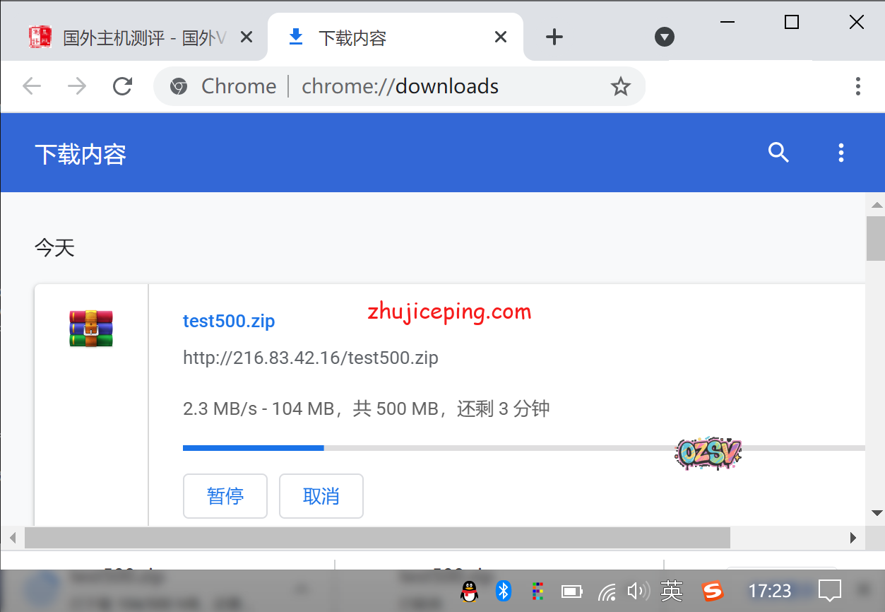 下午5点23分,广州电信,本地Chrome浏览器,下载VPS上的文件速度可以达到2.3M/s: