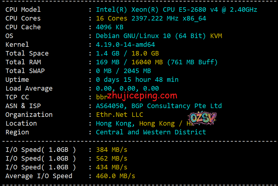 CPU用的是e5-2680v4,站长开启了BBR,硬盘测试I/O大致在460MB/S: