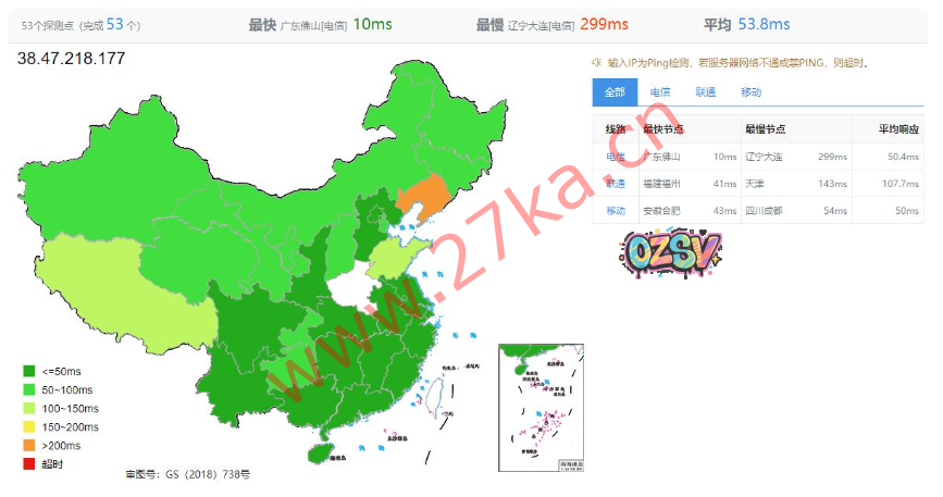 全国三网Ping的平均延迟在53ms左右,其中电信网络50ms,联通网络107ms,移动网络50ms.