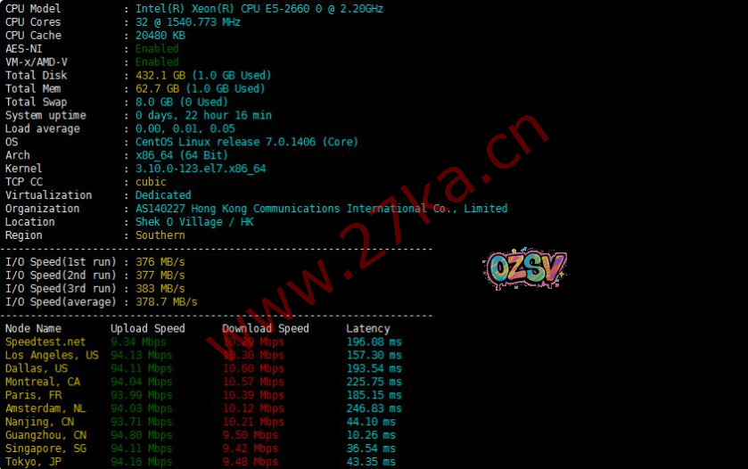 可以看到这款香港服务器使用的2.2 GHz主频CPU,磁盘IO在378MBI秒左右,性能还是不错的。上传速度差不多达到了100Mbps,下载速度跑满10Mbps。