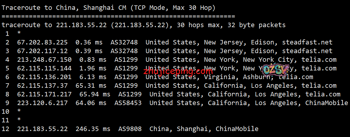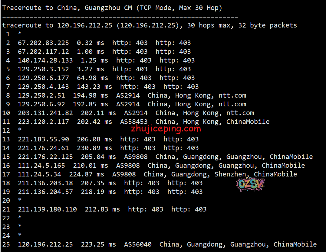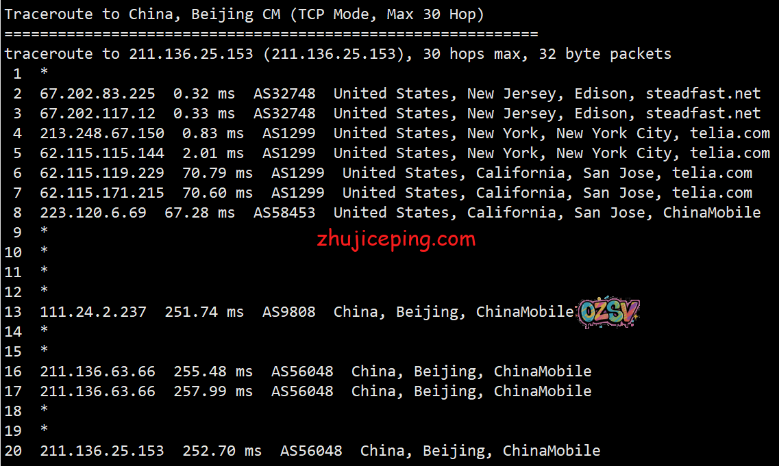 回程,到国内移动:北京方向走的是圣何塞移动节点直接回来,上海方向走的是洛杉矶移动节点直接回来,广州方向是直接走NTT先到香港,然后香港转移动香港节点直接回来
