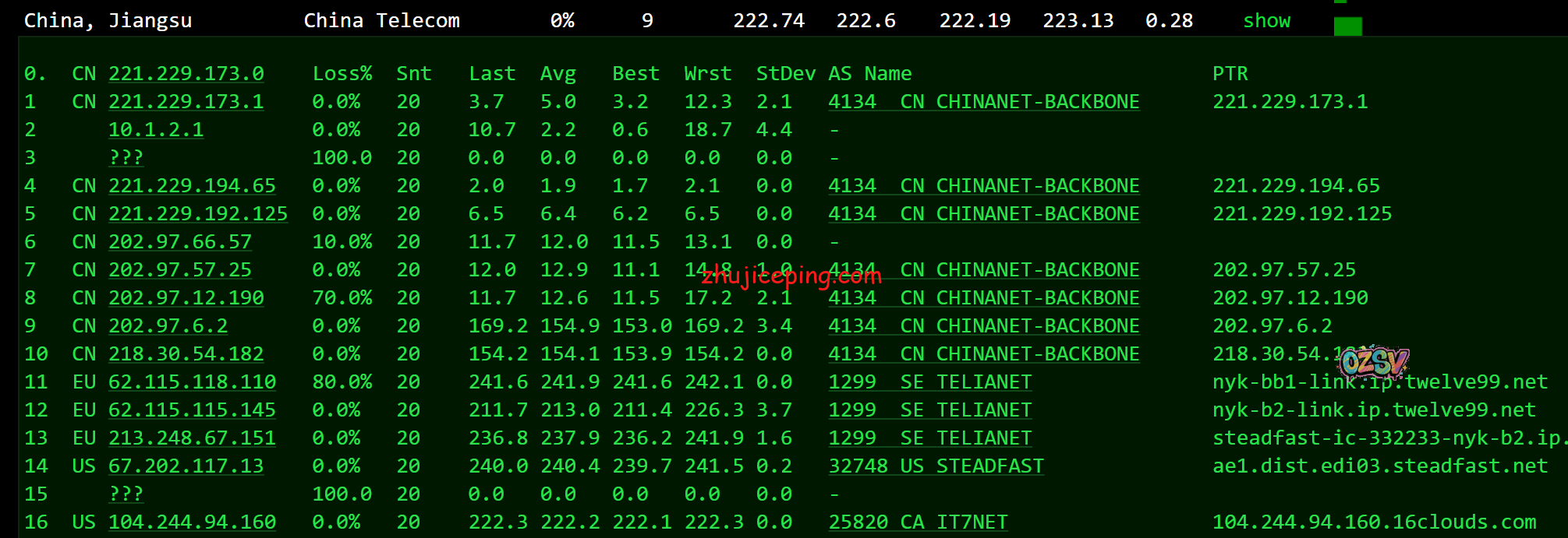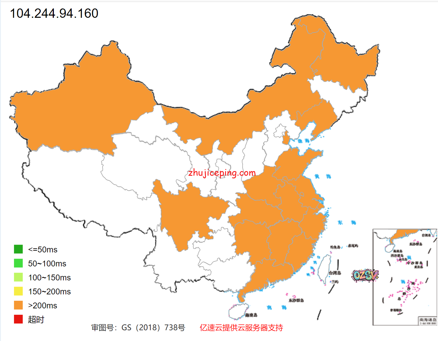 国内80个节点的测试数据,ping.chinaz,com提供: