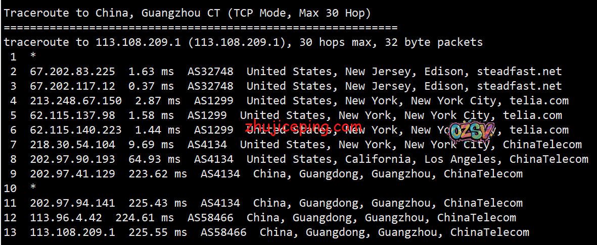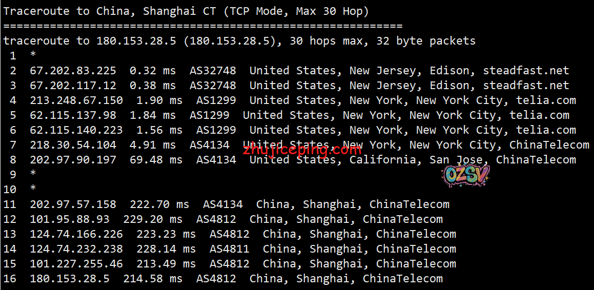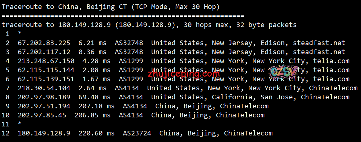 电信去程,骨干网接telia直达纽约: