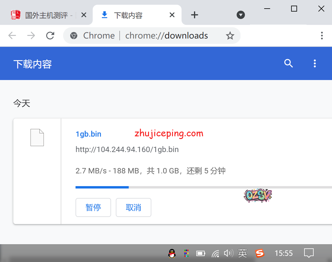 站长是广州电信,只接用Chrome浏览器下载VPS上的文件,下午3点55分,速度大致在2.7MB/S: