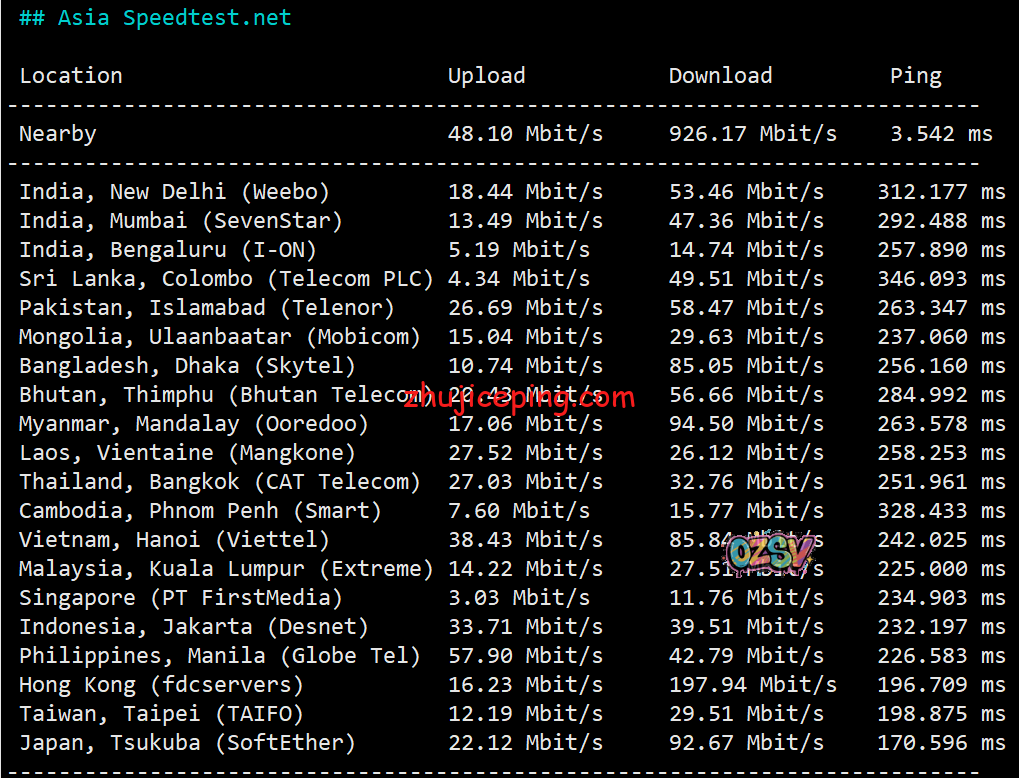 亚洲区域内的其他节点测试: