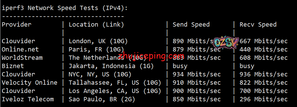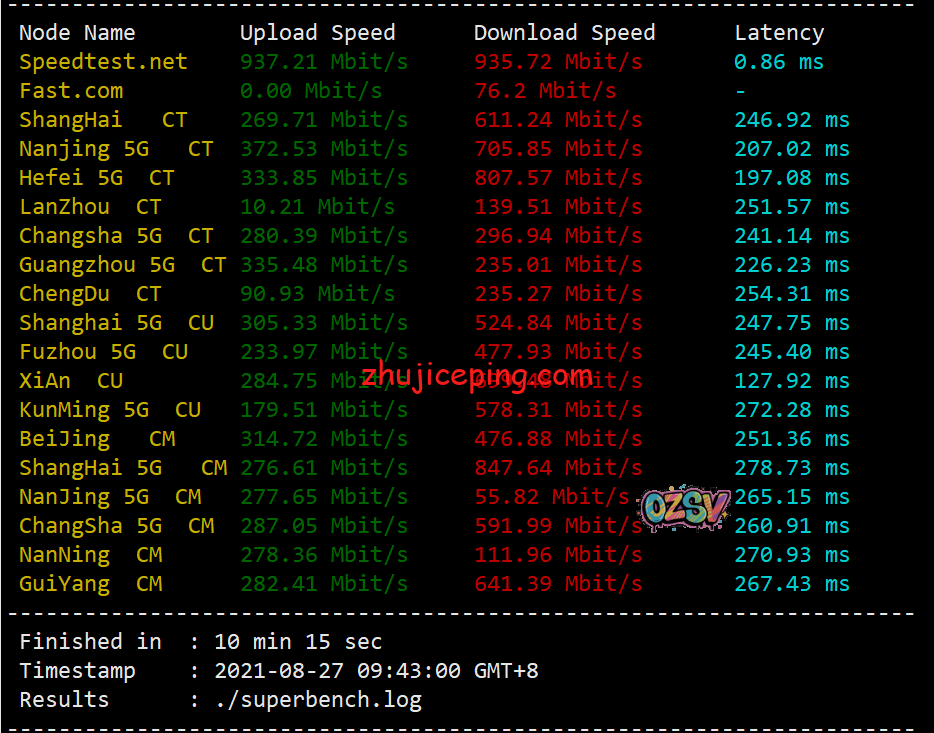 来看看国内节点测试VPS的带宽的上行、下行,结果如下: