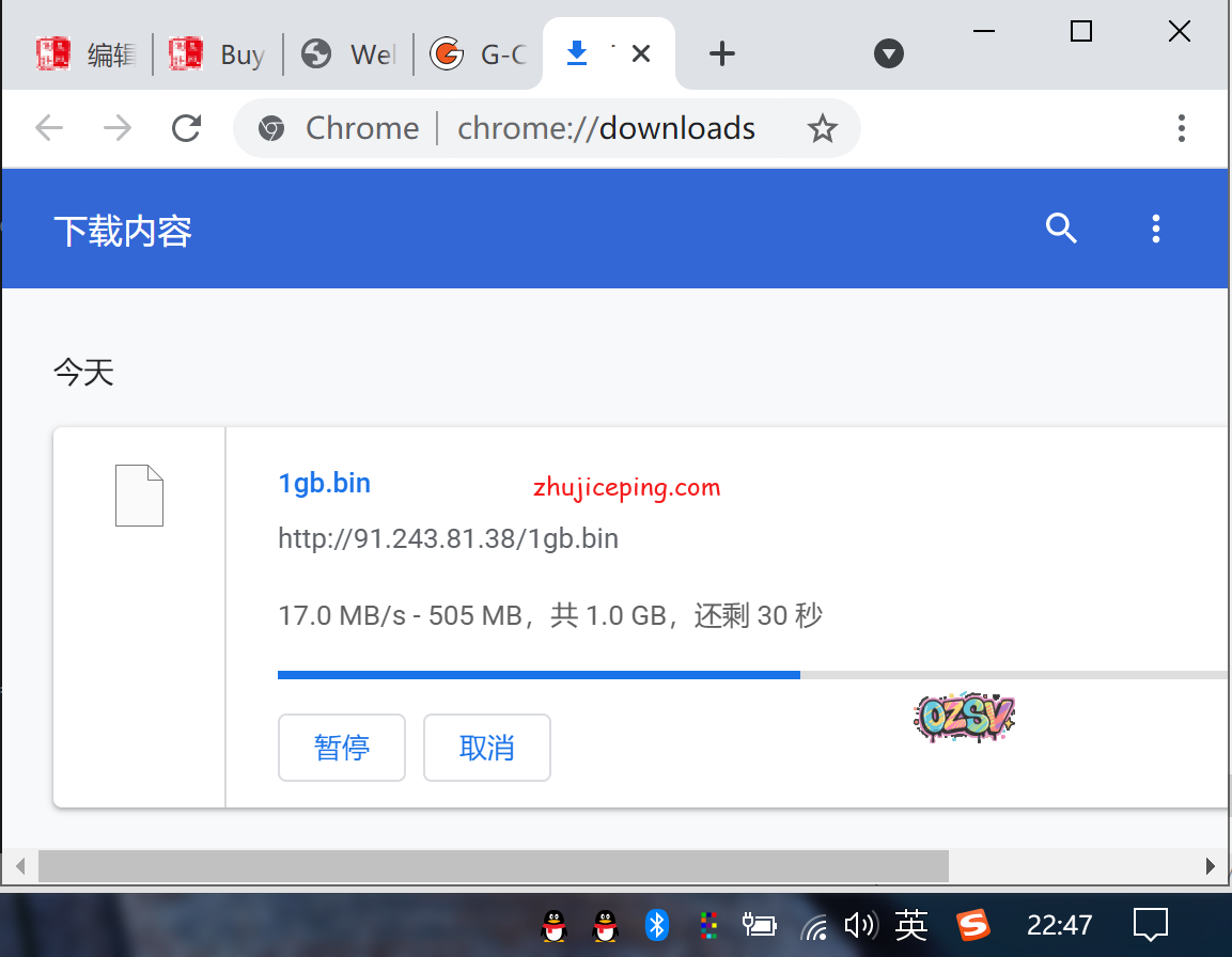 存放在测试云服务器上的文件,广州电信,Chrome浏览器直接下载,晚高峰时间段,速度可以达到17MB/S: