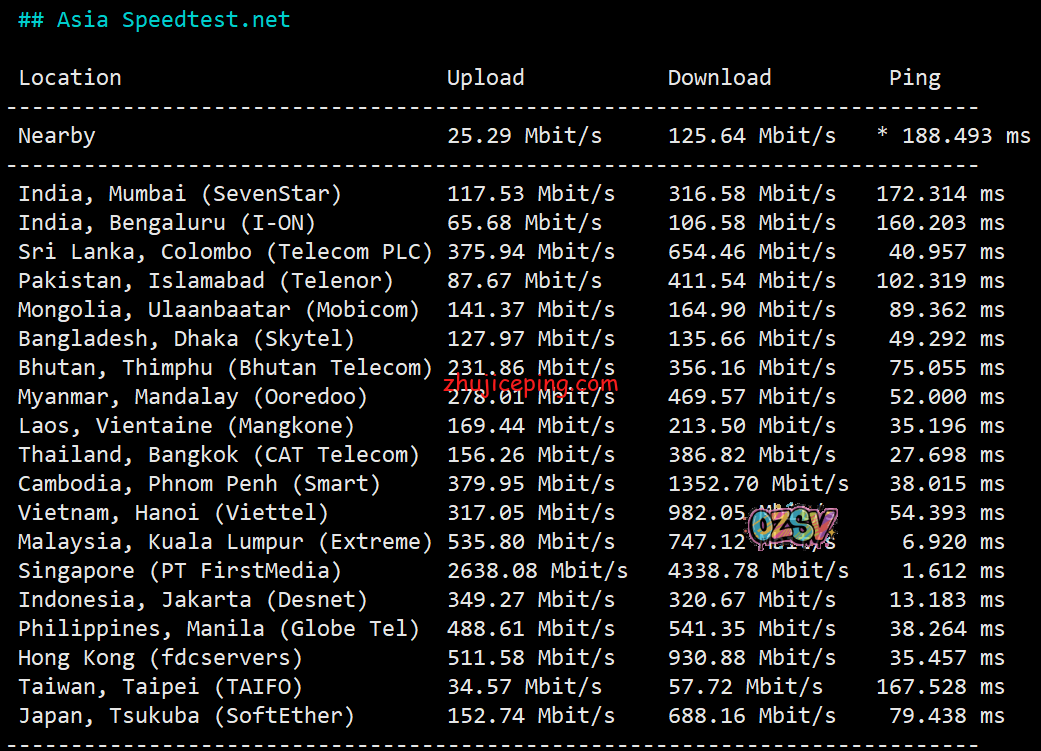 我们用speedtest测试发现:最高上限新加坡可以跑到2638Mbps,最高下行可以跑到4338Mbps