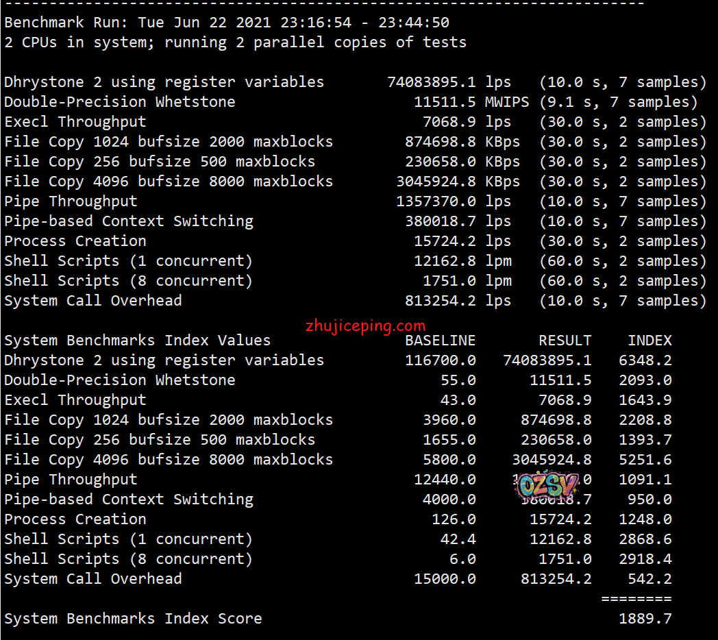 最后上个Unix bench吧,跑分1889,中等偏上水准吧: