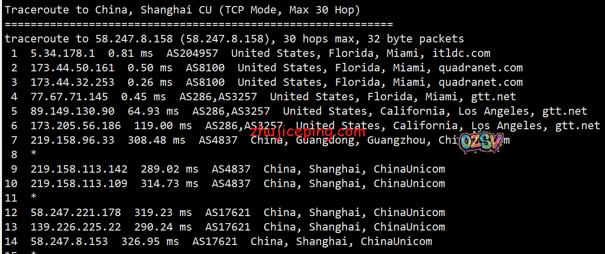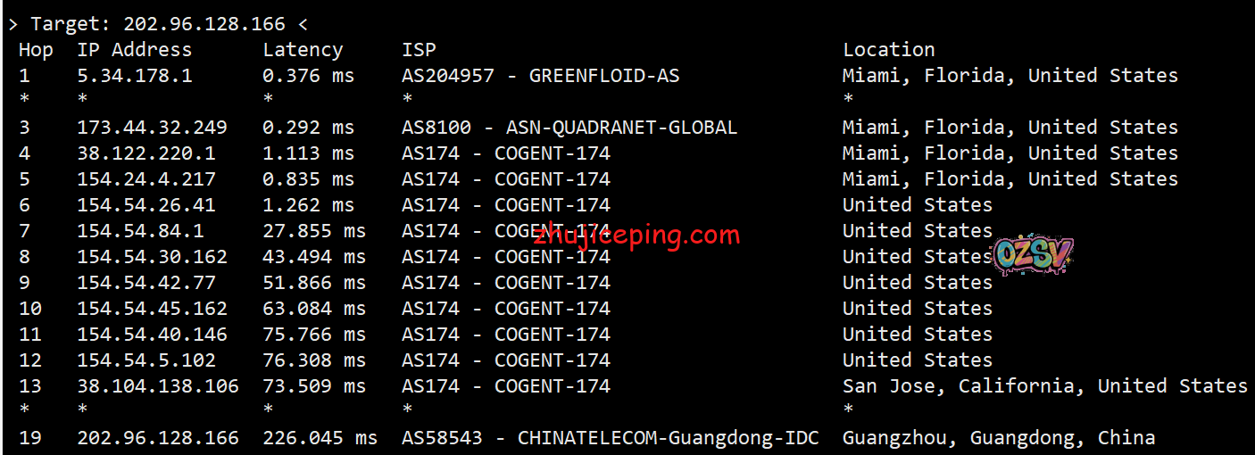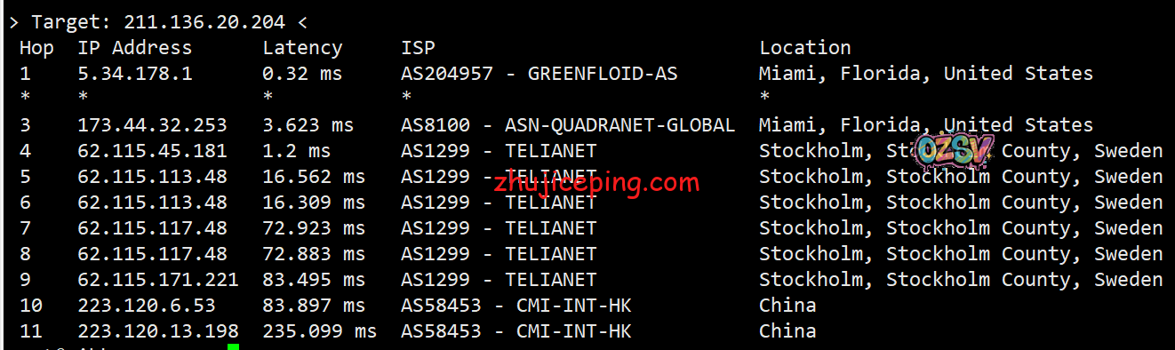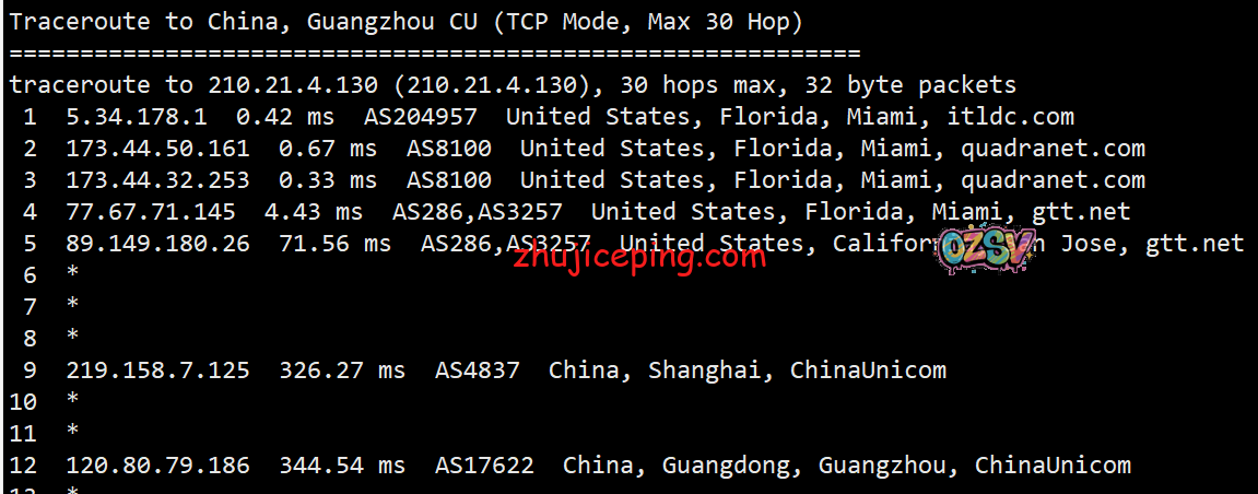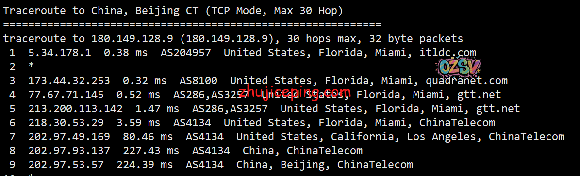 总结下:我们从数据里面可以看到服务器托管在quadranet的迈阿密机房,从回程来看只有移动严格意义上来说是从美国直连的,其余的不是telia就是cogentco再或者GTT。当然,实际网络能跑到什么样子,也还是需要大家自己测试才清楚,这里只是一个简单的参考。