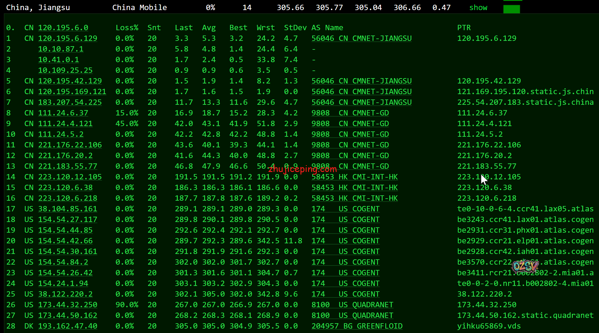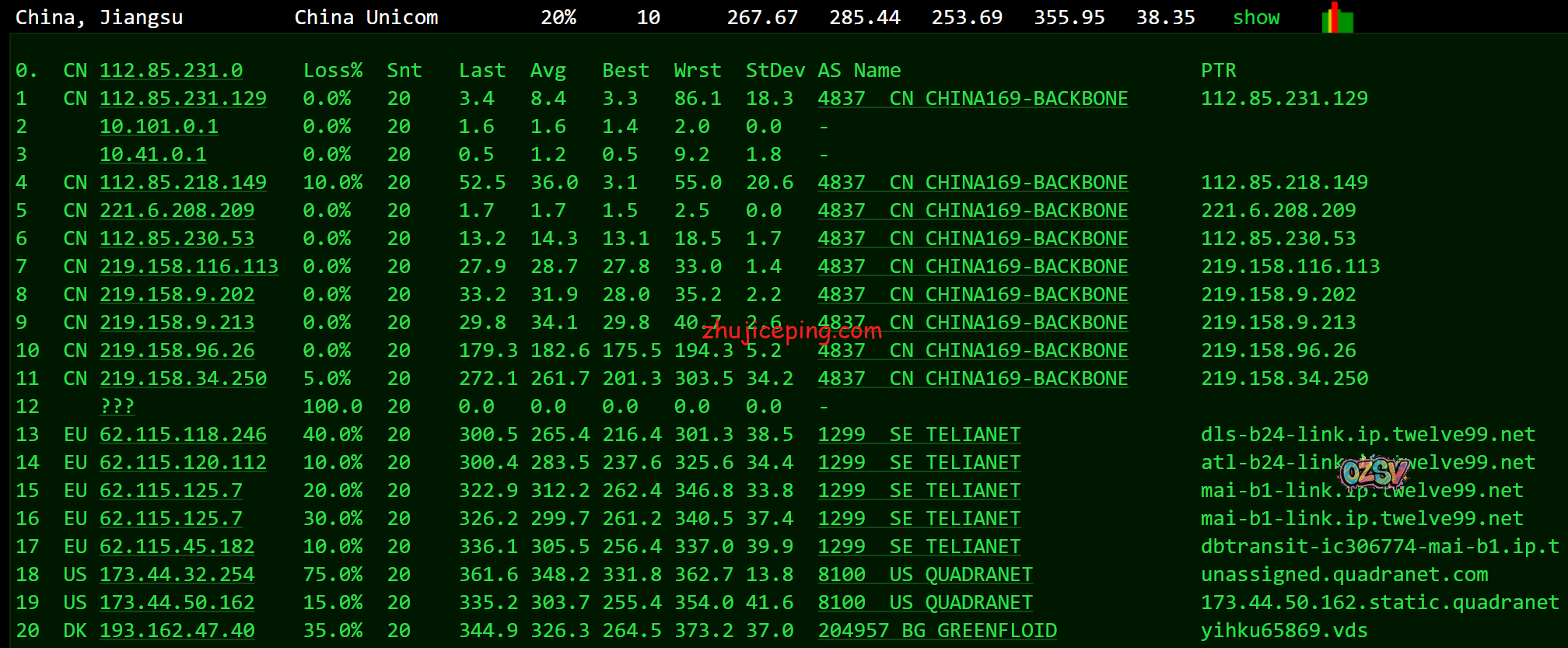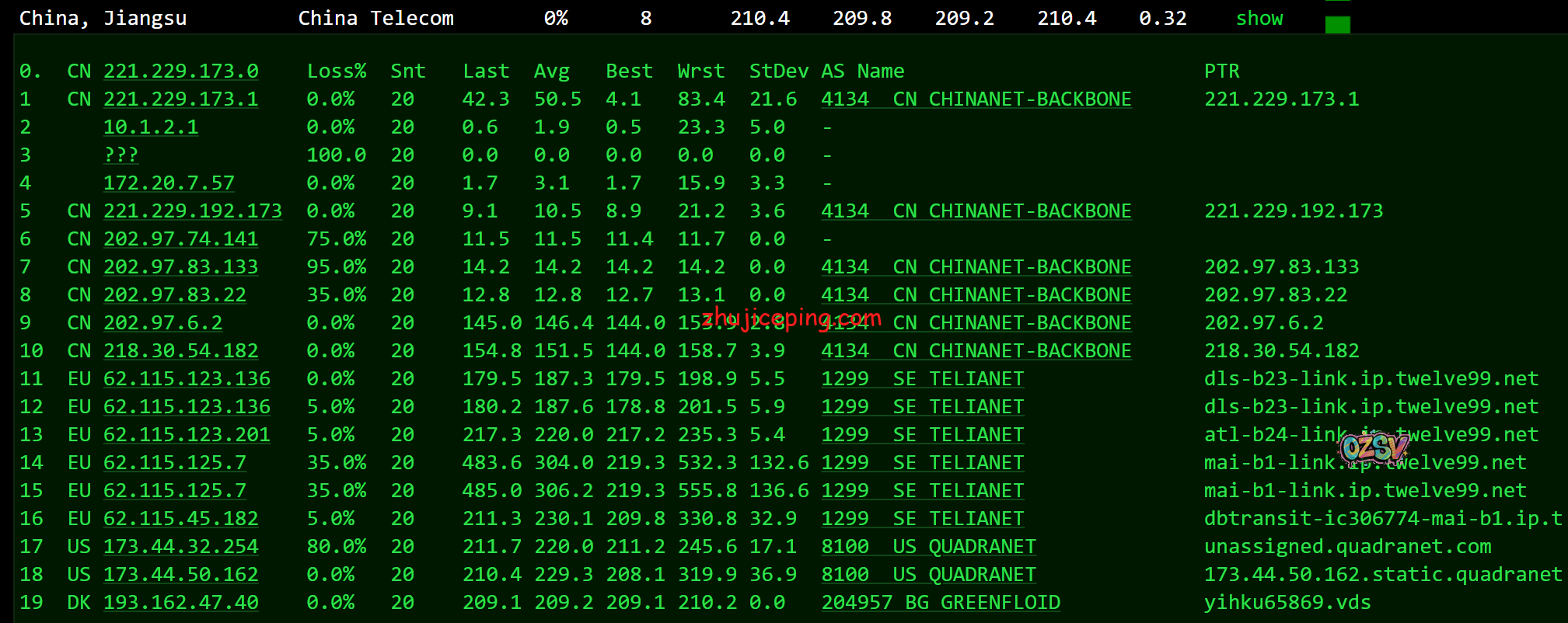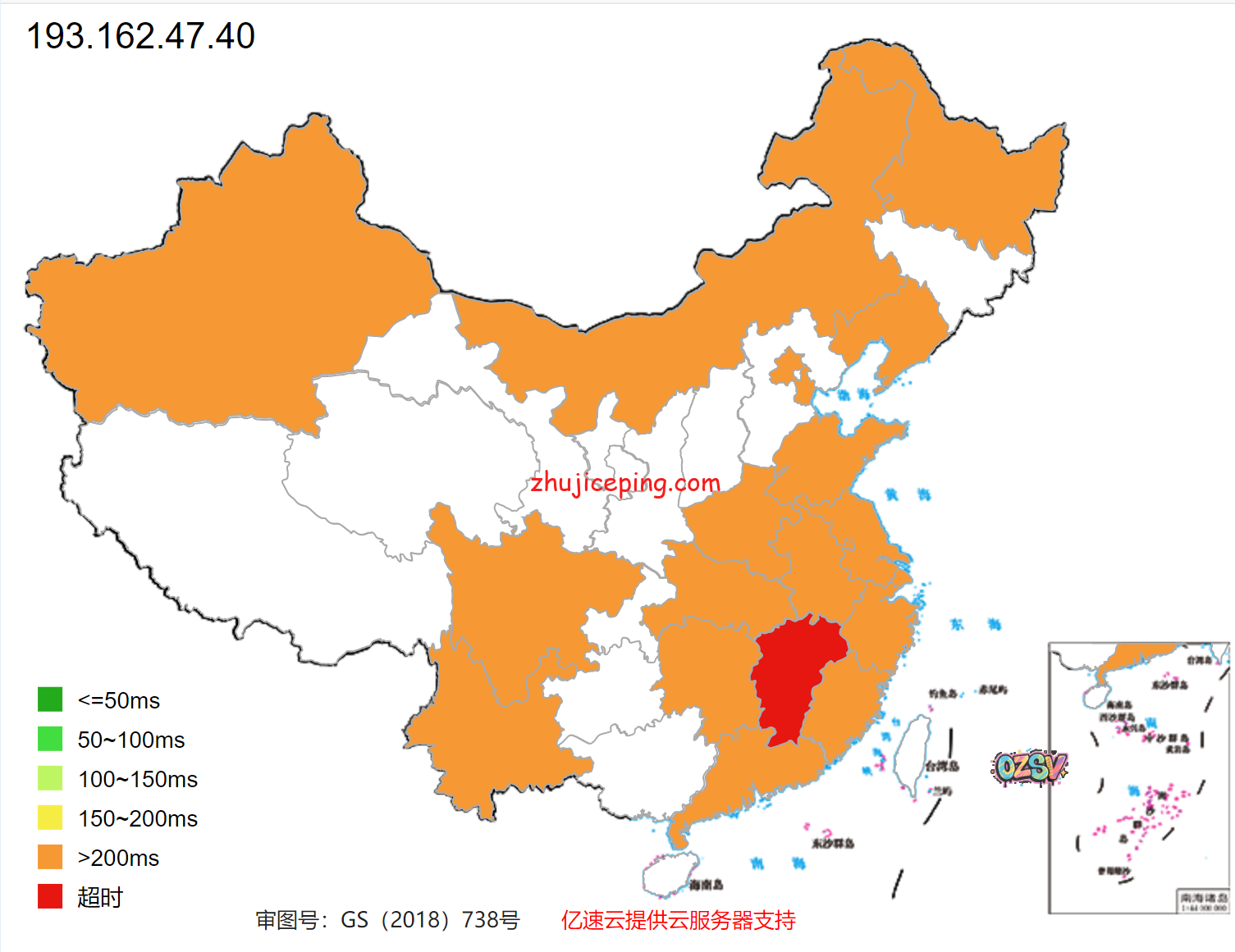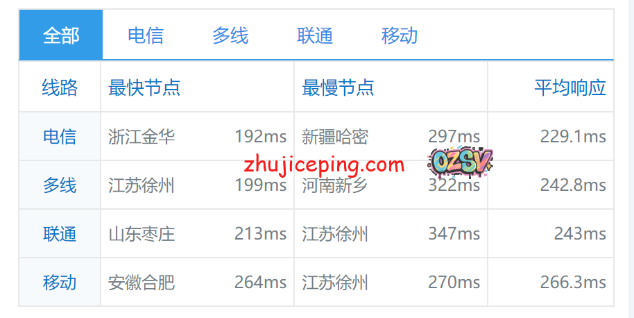 下方是ping.chinaz.com提供的国内80个节点的ping测试数据: