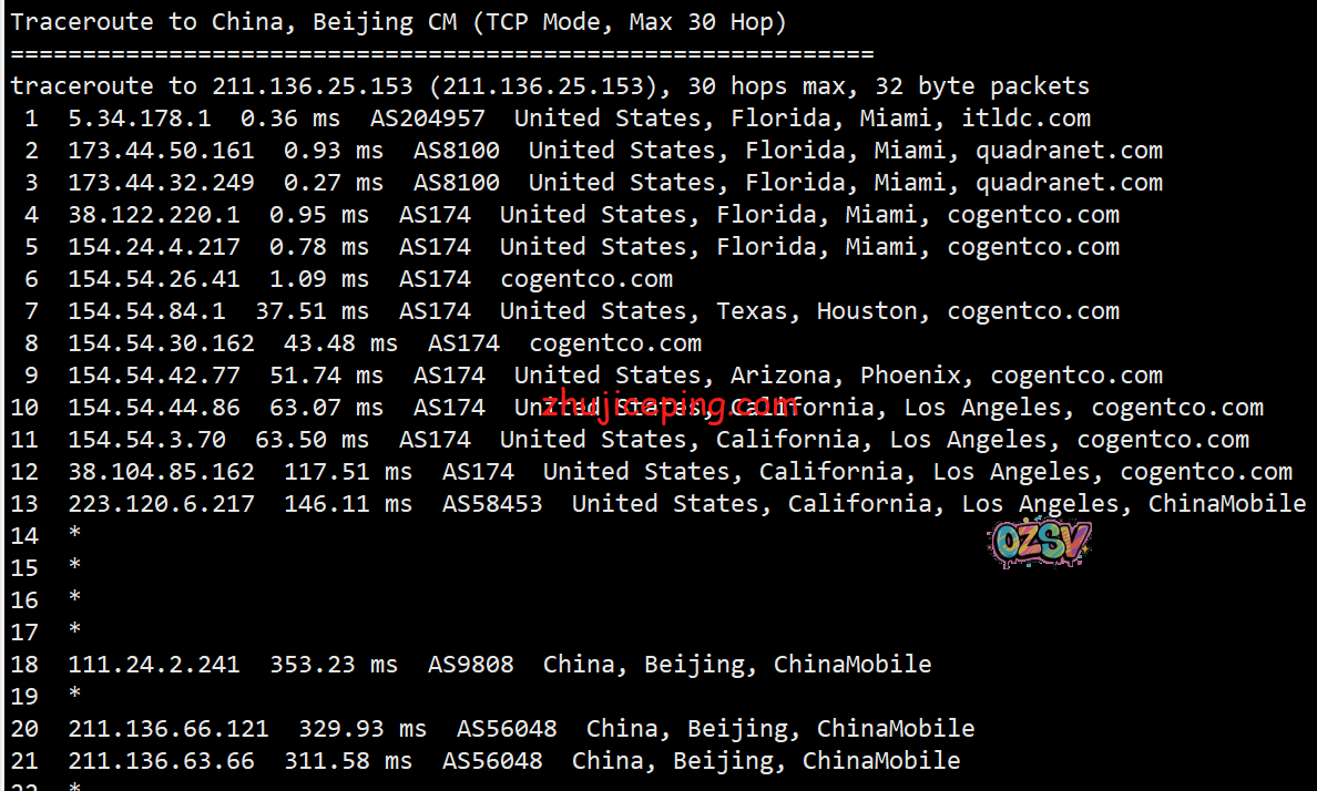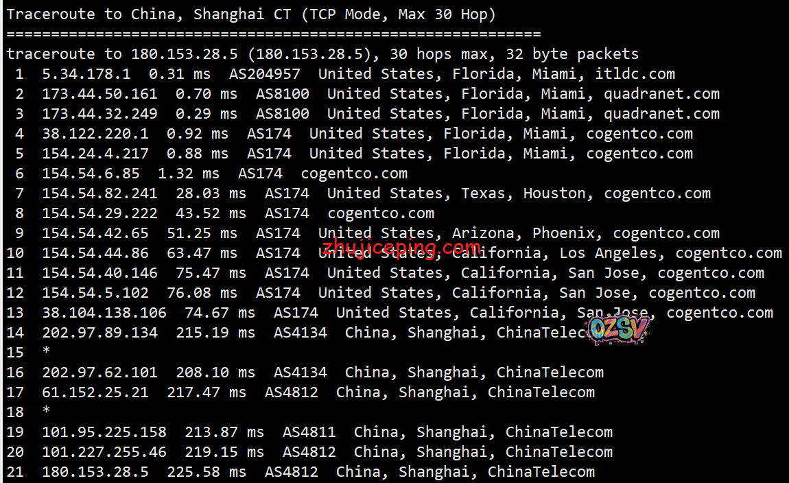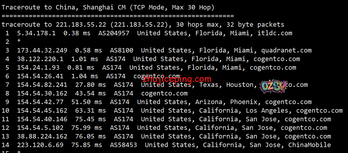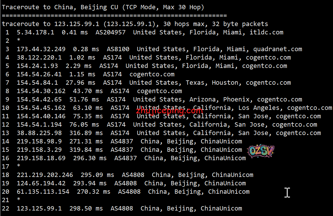 回程,到国内电信:北京方向是从洛杉矶电信节点直连回国,上海和广州方向是cogentco对接电信骨干,