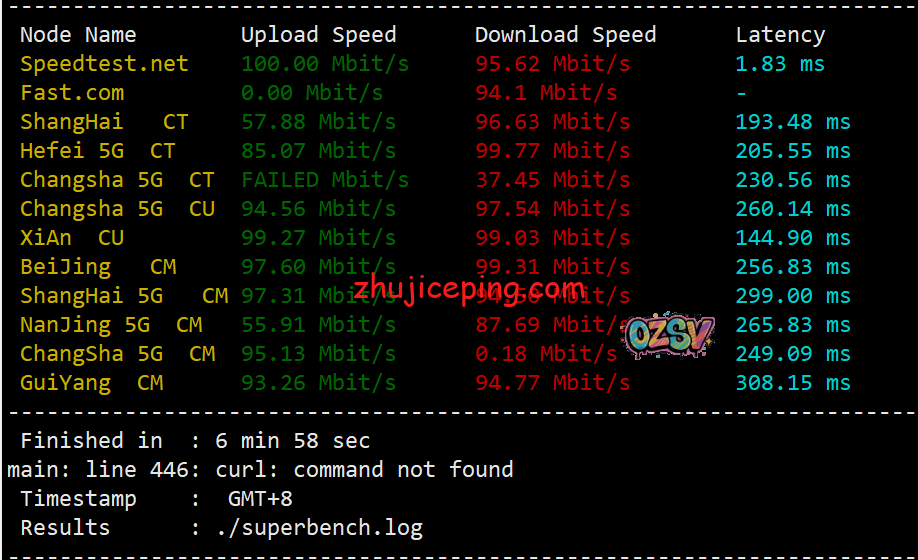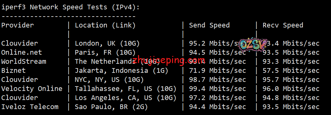 每个VPS默认是限制100Mbps带宽,不限制流量,我们用speedtest.net提供的国内节点来测试一下VPS的上下行带宽,从数据来看,基本上是可以跑满的: