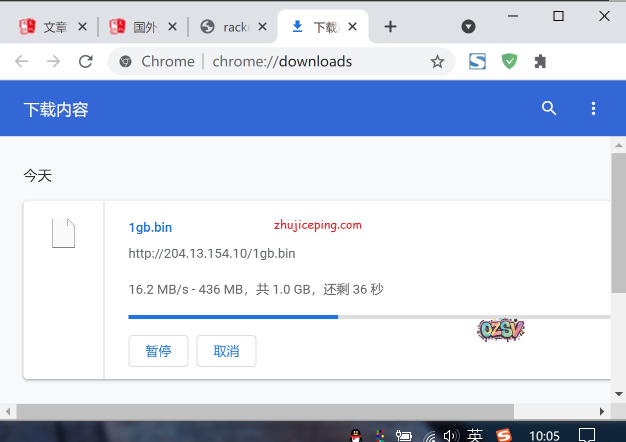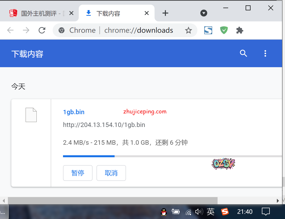 广州电信,Chrome浏览,直接下载测试文件,晚高峰 2.4MB/s: