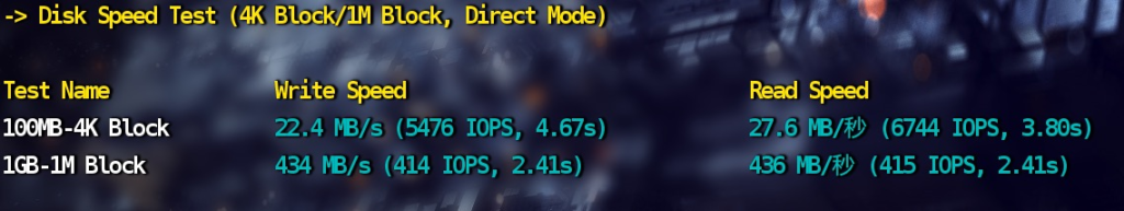 站长弄了一台美国高防的服务器,官方说的是50Mbps带宽。拿到机器,CPU为E5-2660v2,测试硬盘I/O在436MB/s的样子: