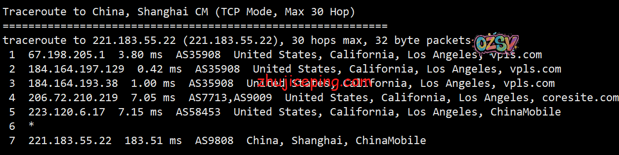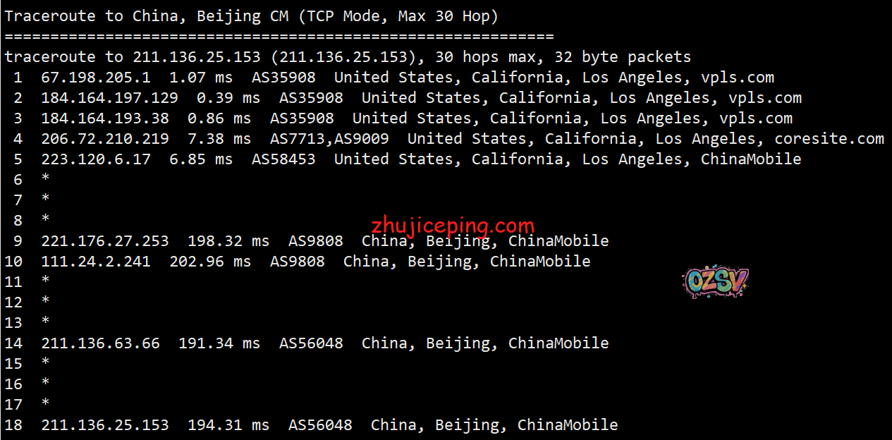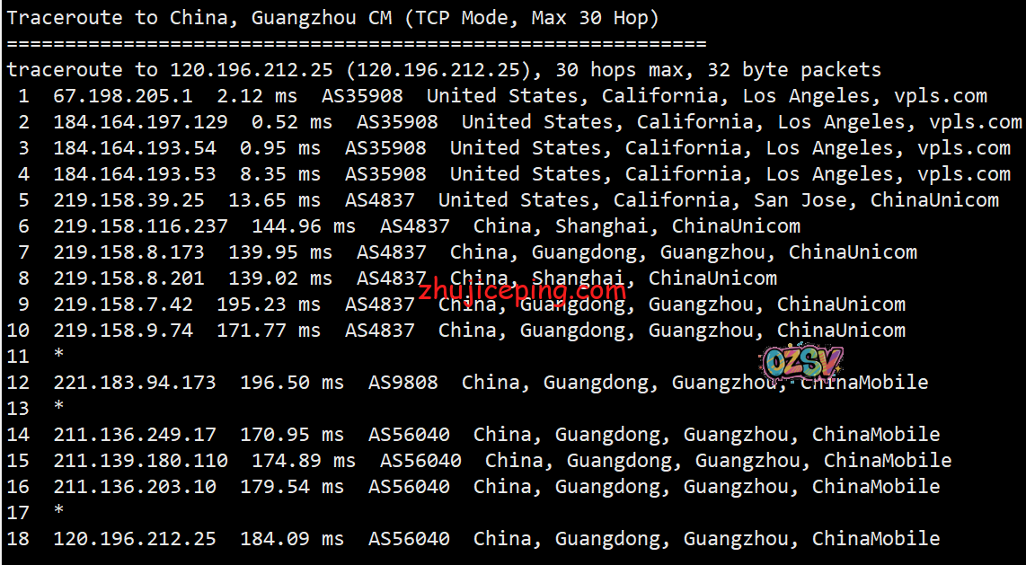 回程,到国内移动:北京和上海方向是从洛杉矶直连回国的,广州方向是从圣何塞出来走联通AS4837链路回国的
