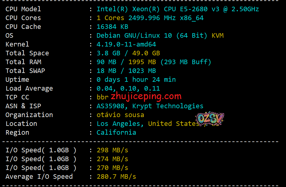 洛杉矶的VPS或者说云服务器用的CPU是e5-2680v3,2.5GHz主频,站长用的是2G内存、1核的最低配置,开启BBR,硬盘大致280MB的I/O: