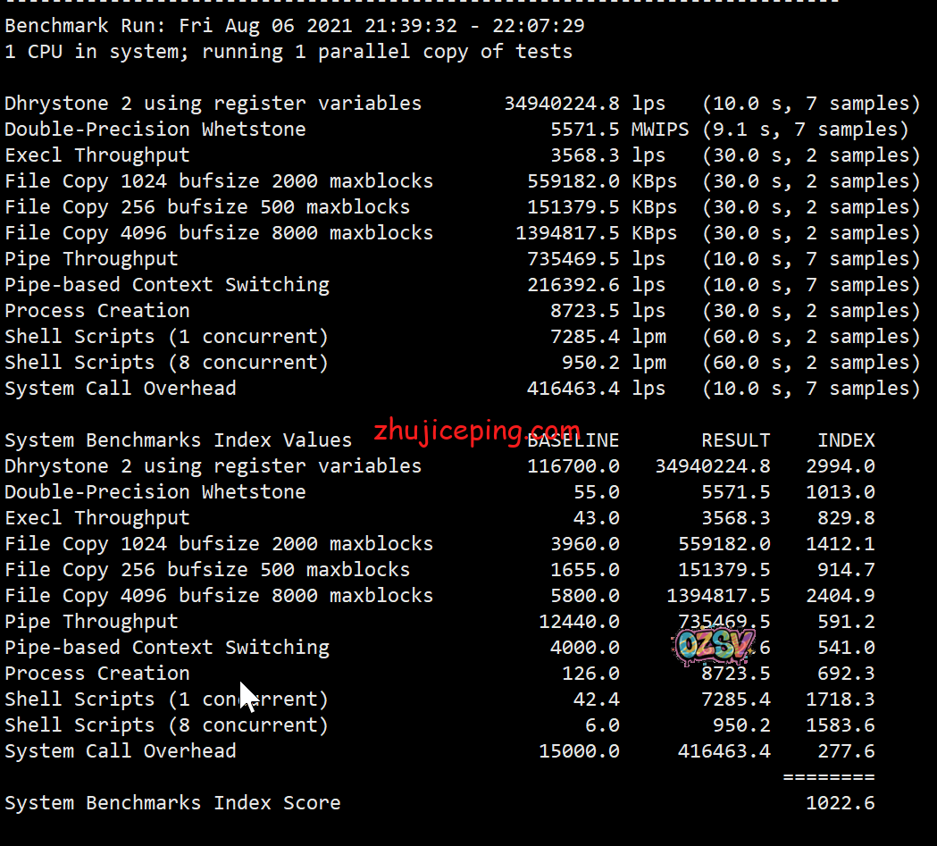 来跑个Unix bench,1022分,不算差了! 其实这个跑分意义不大的,VPS的CPU、硬盘I/O、网络等资源其实都是共享的,别指望霸占满了。