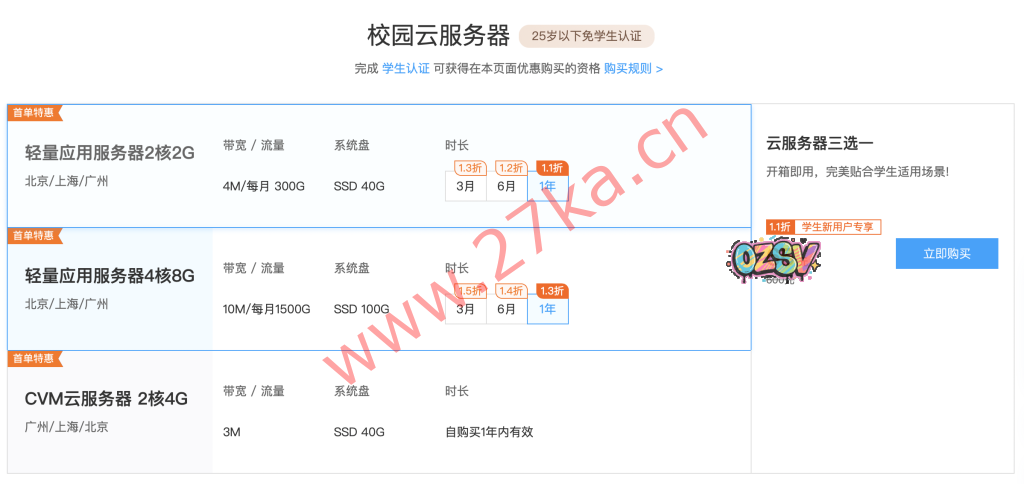 腾讯云学生云服务器近期做出了调整,目前腾讯云学生云服务器有北京、上海、广州轻量应用服务器(最高10M带宽端口轻量应用服务器可以选择)广州、上海、北京CVM云服务器(3M带宽不限流量云服务器),广州、上海、北京、重庆、成都、南京GPU服务器(8核32G内存高配置GPU云服务器)、中国香港、新加坡、东京轻量应用服务器(30M大带宽海外云服务器)可以选择,最低只需65元/年起!性价比超高,属于便宜腾讯云服务器!