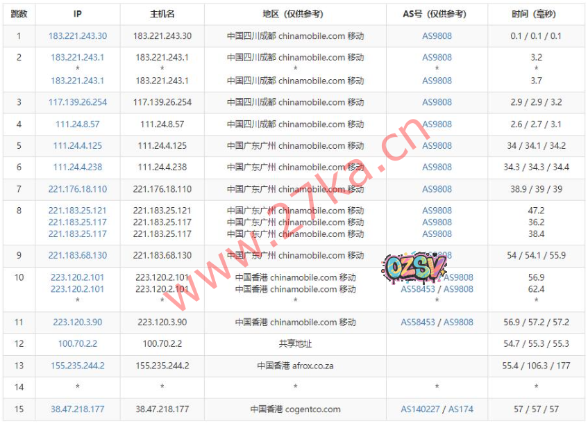 移动去程路由是从广州网口出去,然后直连香港机房,走的是移动CMI线路。