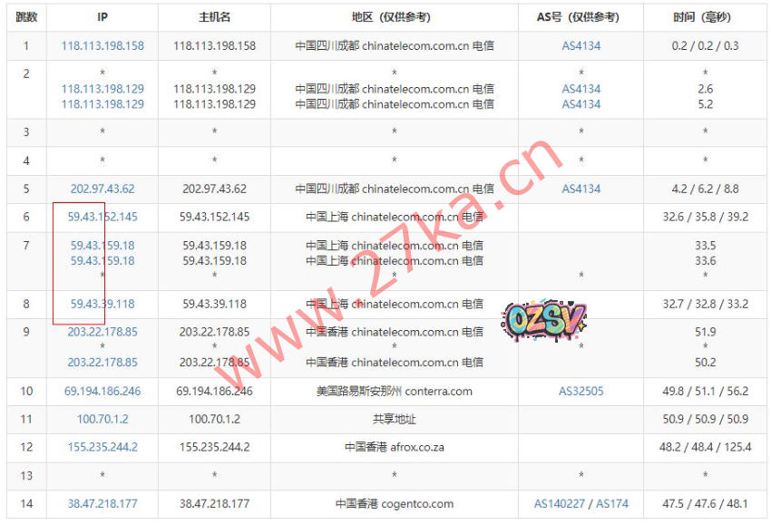 电信去程路由是从上海网口出去,然后直连香港机房,走的是59.43的CN2线路。