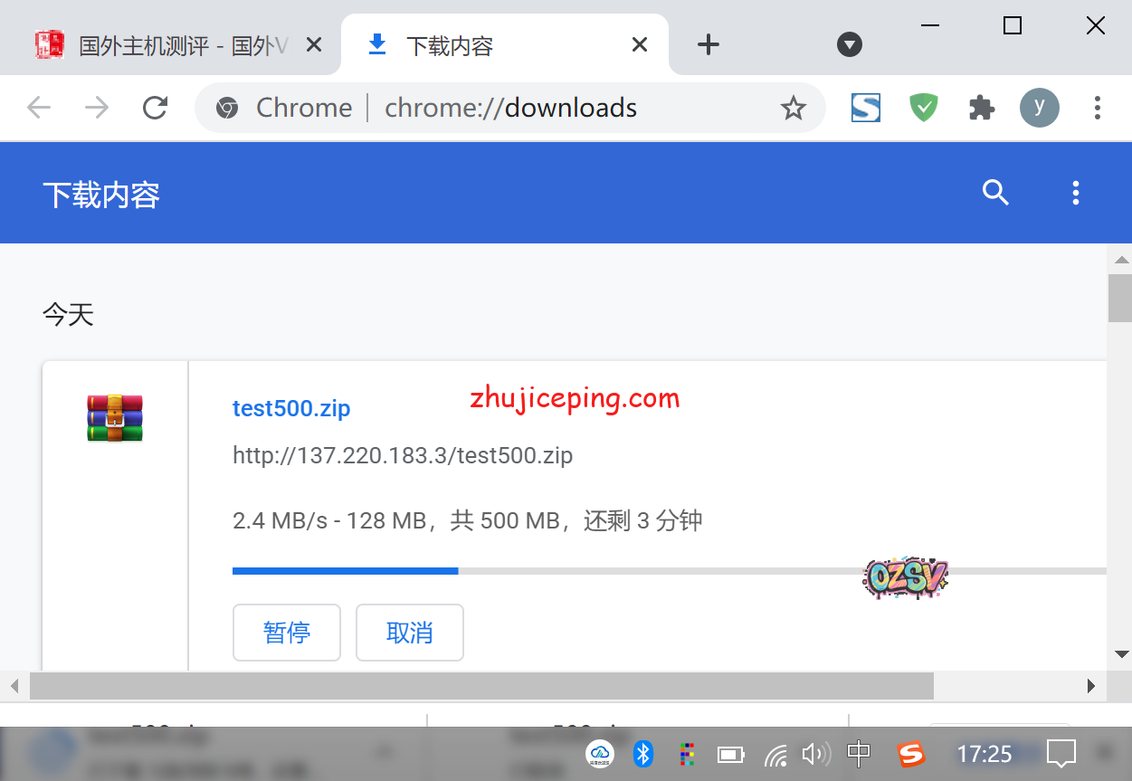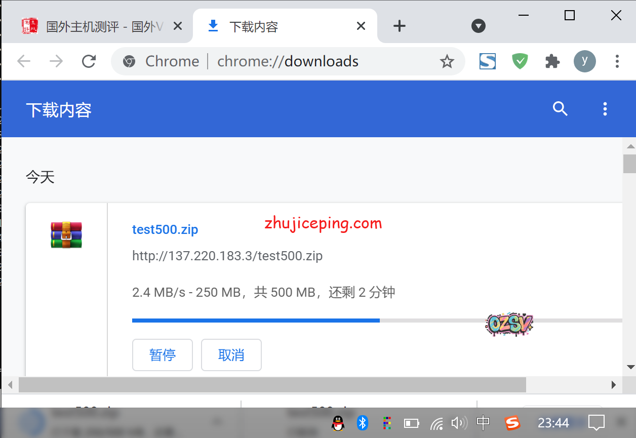 主机测评在测试的VPS上面存放了个文件,广州电信,本地Chrome直接下载测试出来的速度如下: