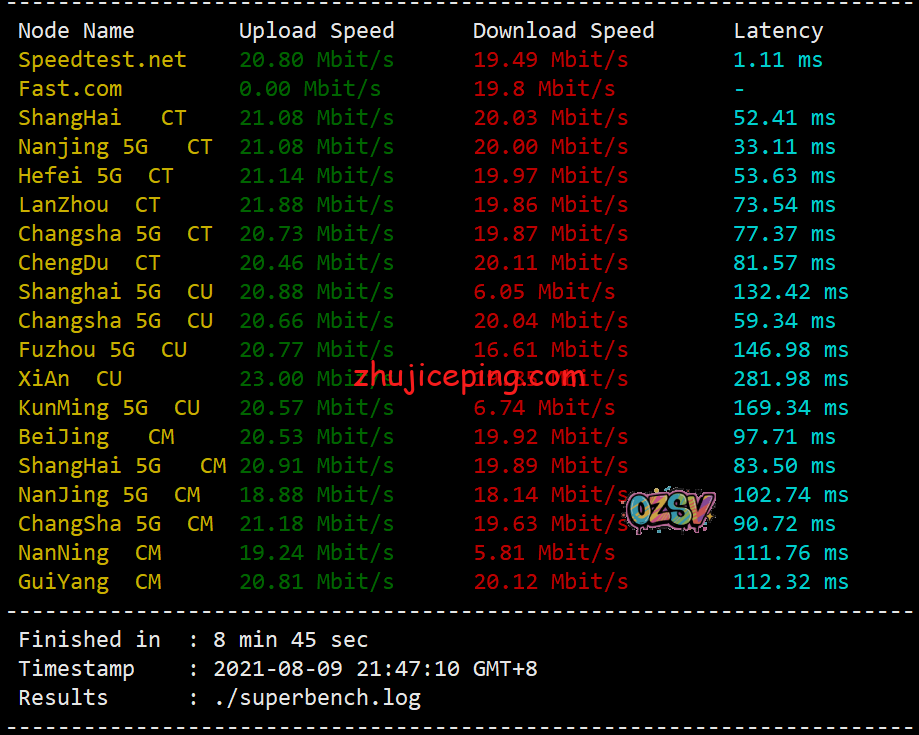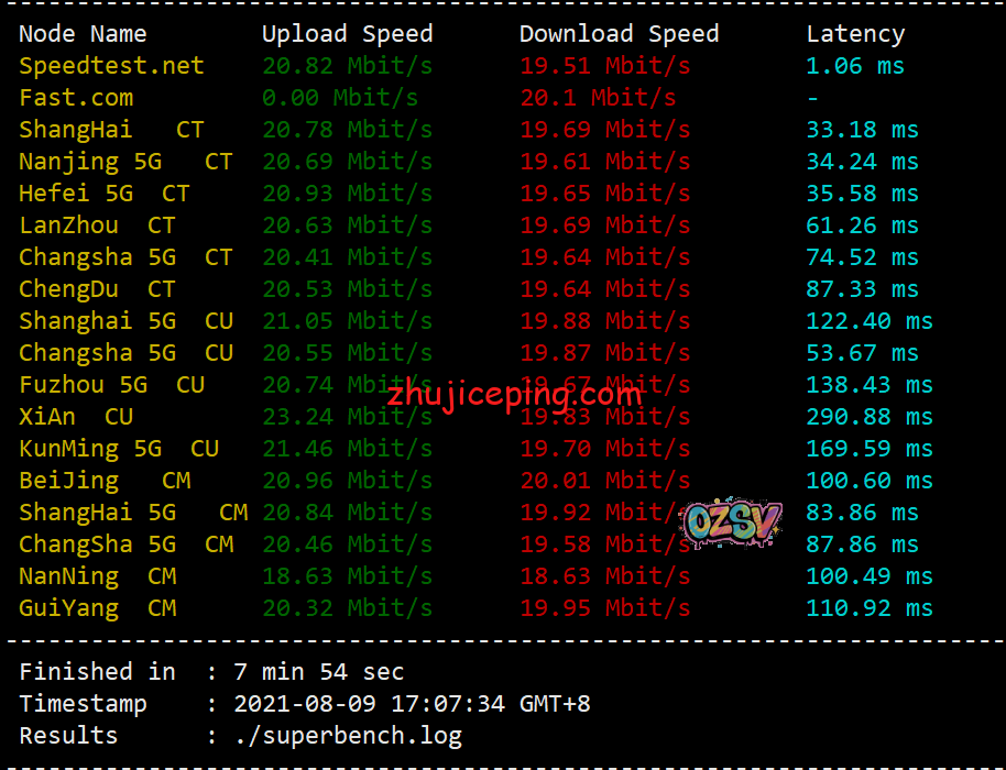 站长拿到的是20Mbps带宽的,我们用speedtest中国区节点来测试一下这个VPS的上行、下行带宽,如下图,基本上突发带宽是达标的: