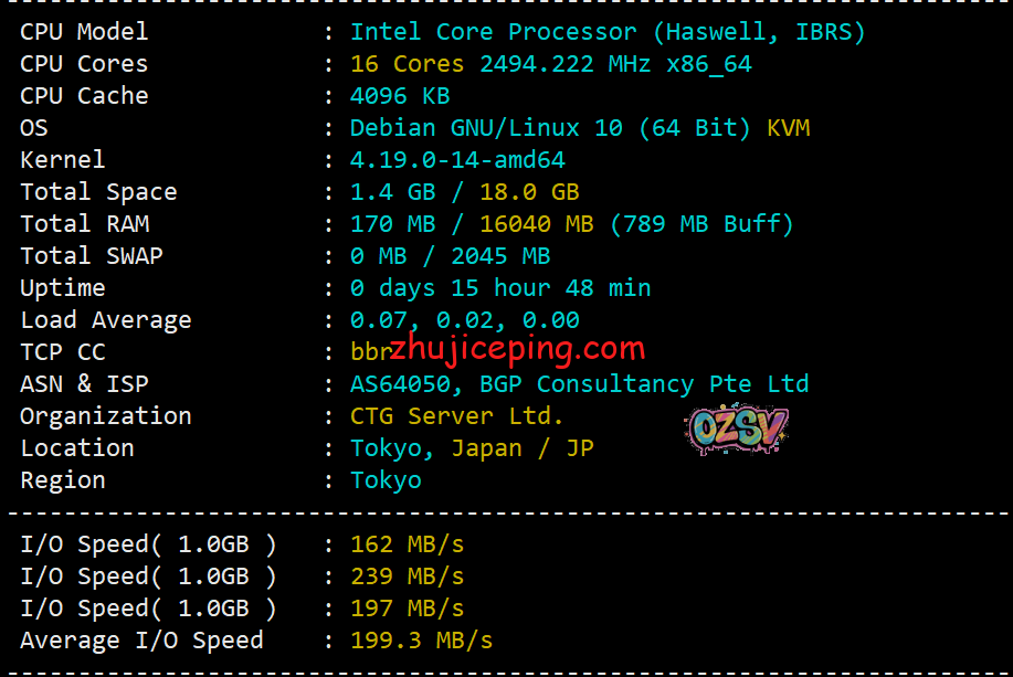 看不到CPU型号,主频大约2.5GHz,开启了BBR,硬盘I/O大致199MB/S: