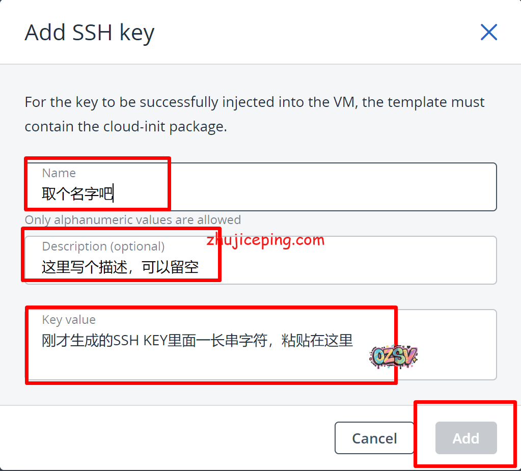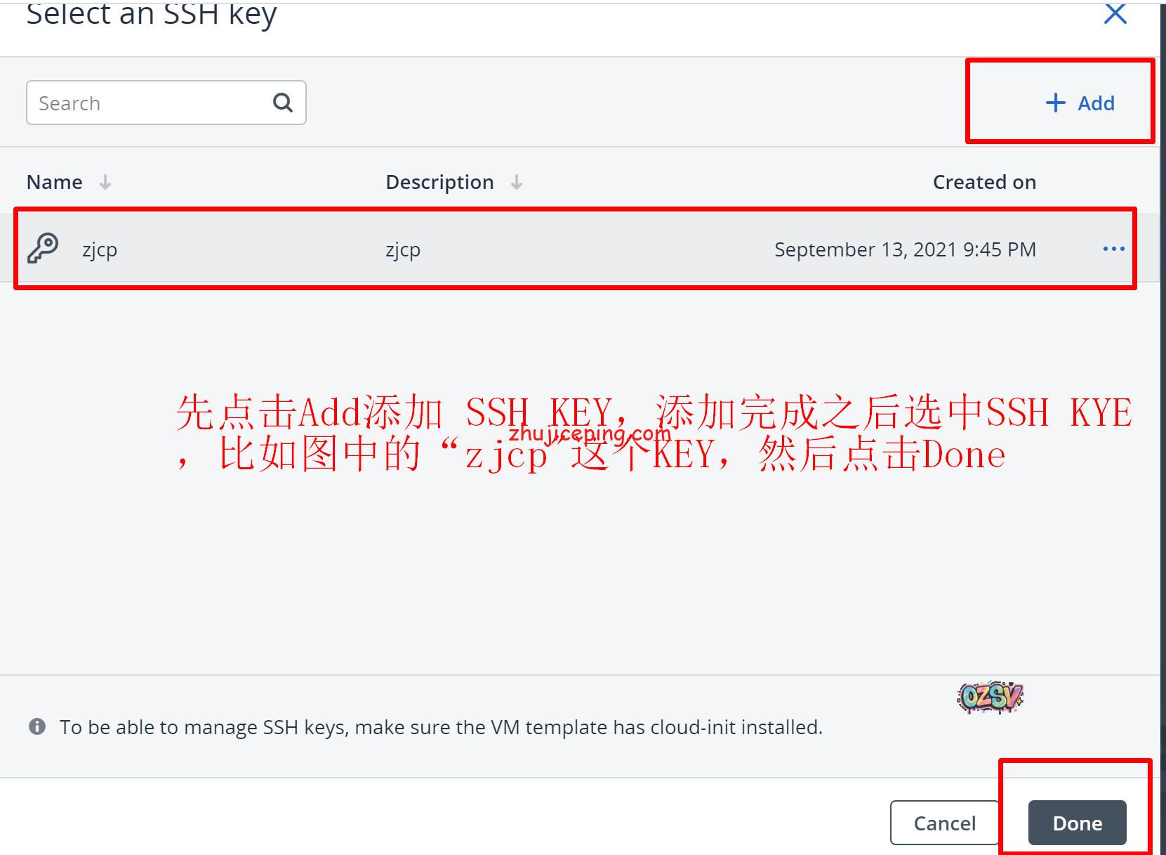 点击Add,然后添加 SSH KEY的信息,然后选中自己添加的KEY,比如 图中名称为zjcp的这个key。这个添加SSH KEY的步骤,我们也可以上前面的“图B” 左下角的“ssh keys”里面单独实现,可事先添加好,然后在这里直接选中“zjcp”这个已经添加好的ssh key就行了。