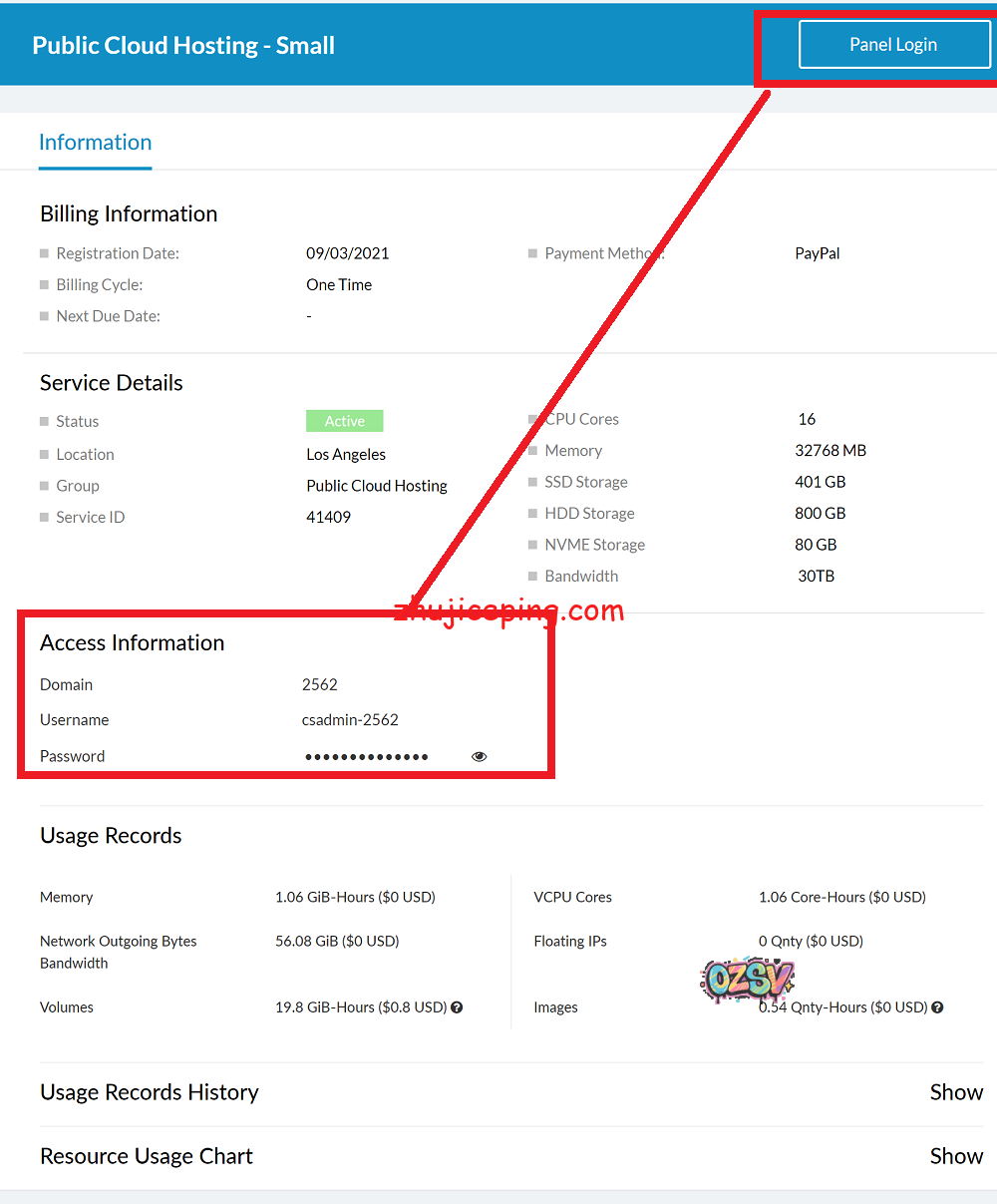 购买成功后,我们在 sharktech.net 官方后台可以看到大致下面的界面,我们直接点击Panel Login进入公共云服务器管理面板,需要用到的登录信息你可以去自己的电子邮箱里面找,也可以在下图里面的“Access Information”清晰地看到: