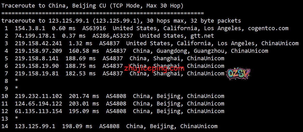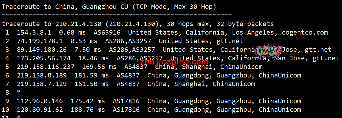回程,到国内联通:北京和上海方向都是从洛杉矶联通节点出口直接走AS4837回来;广州方向走的是圣何塞GTT到接AS4837到上海然后去广州。