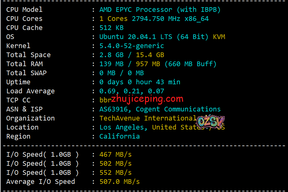 AMD系列的CPU,主频2.8GHz,没事我就顺手把BBR开启了,硬盘I/O大致507MB/S: