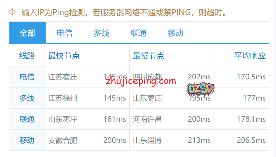 ping.chinaz.com提供的国内80个节点的测试数据,测试时间段是晚上10点多: