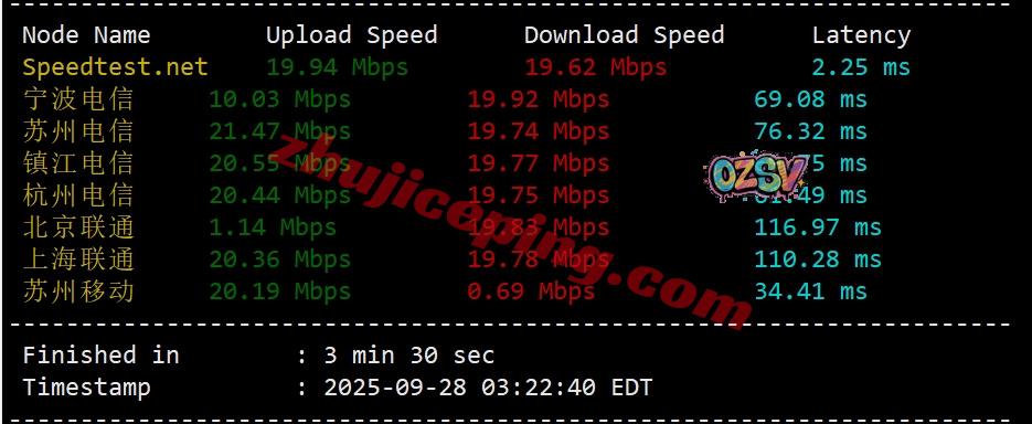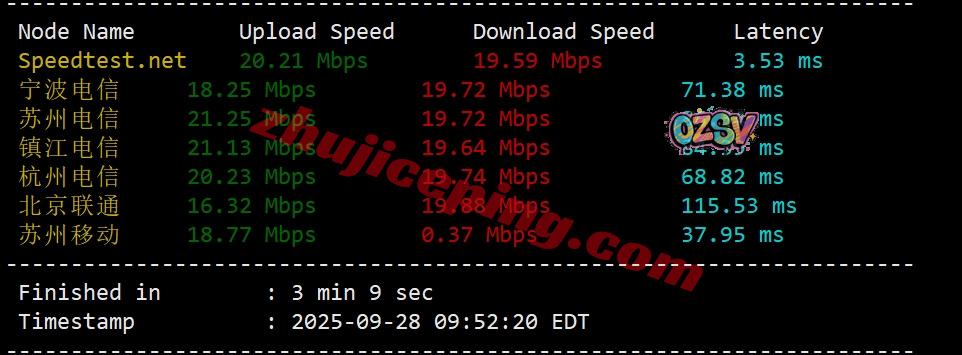 国内三网多节点的带宽上下行+延迟测试数据: