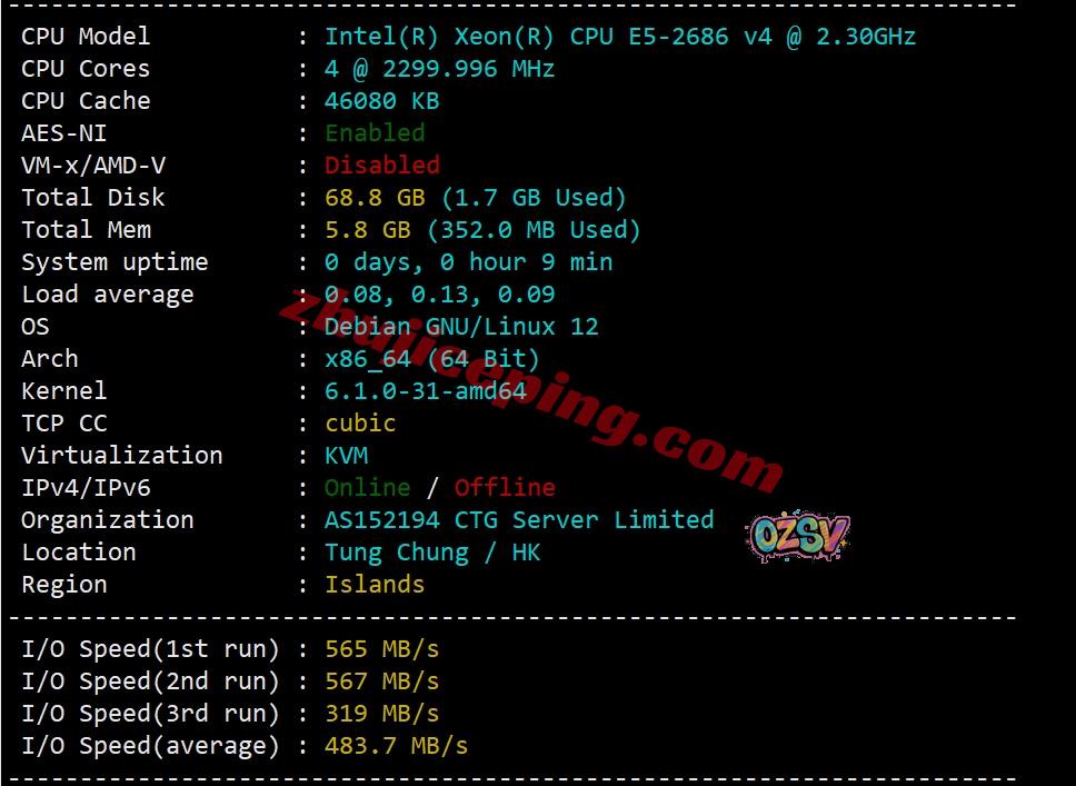 服务器用的CPU型号为e5-2686v4(单路为18核/36线程、基础频率2.3GHz,最大睿频3.0GHz),底层KVM虚拟,不支持IPv6,上游网络提供商为CTG SERVER,归属地香港,当前实测I/O大致483MB/S:
