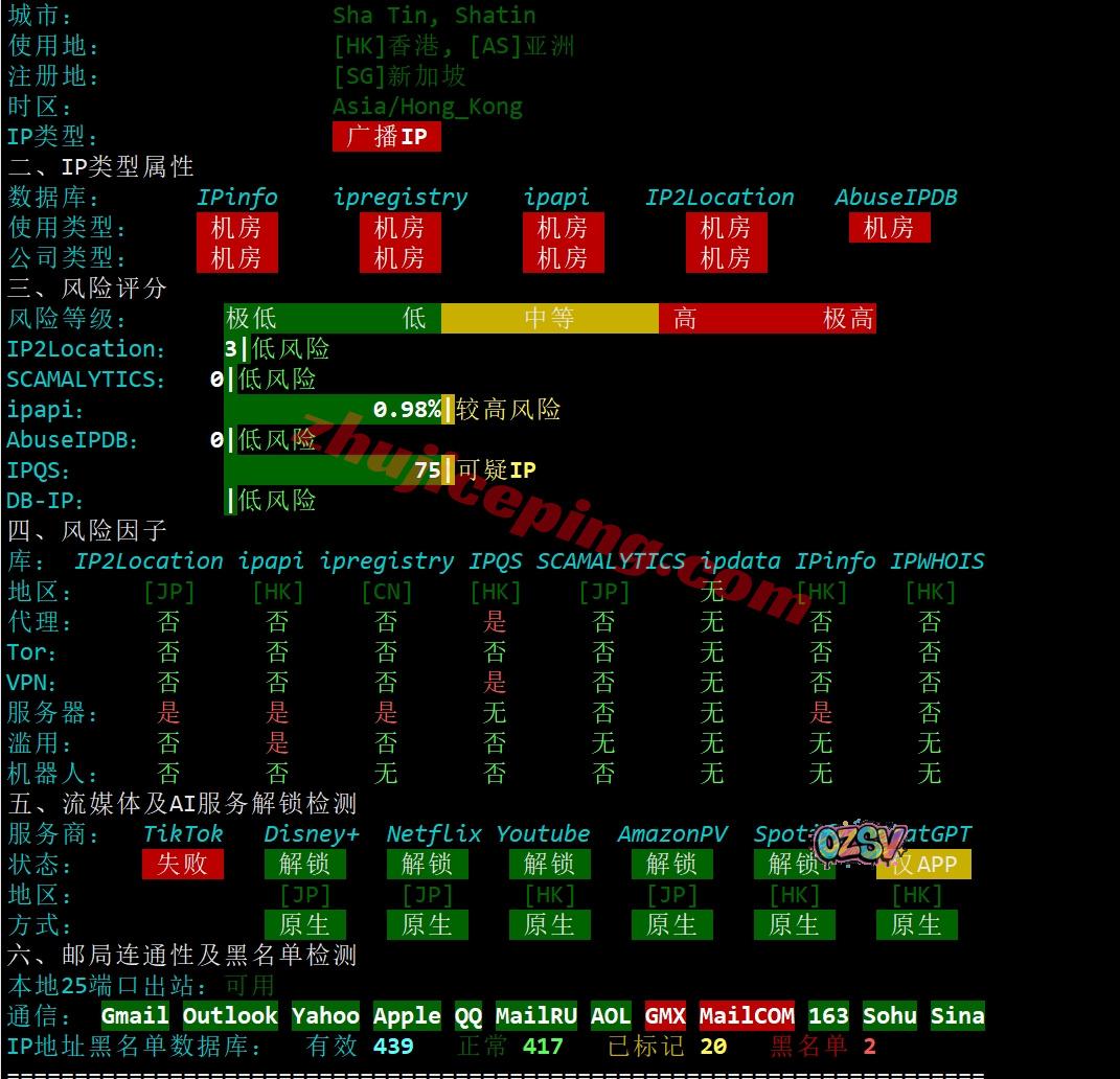 IPv4为广播IP,无法解锁chatgpt,香港地区默认是无缘tiktok的,netflix、steam currency等可以搞定;