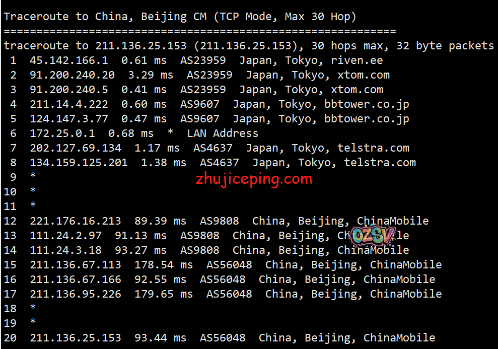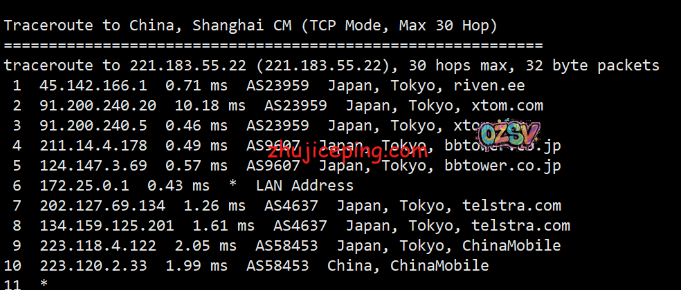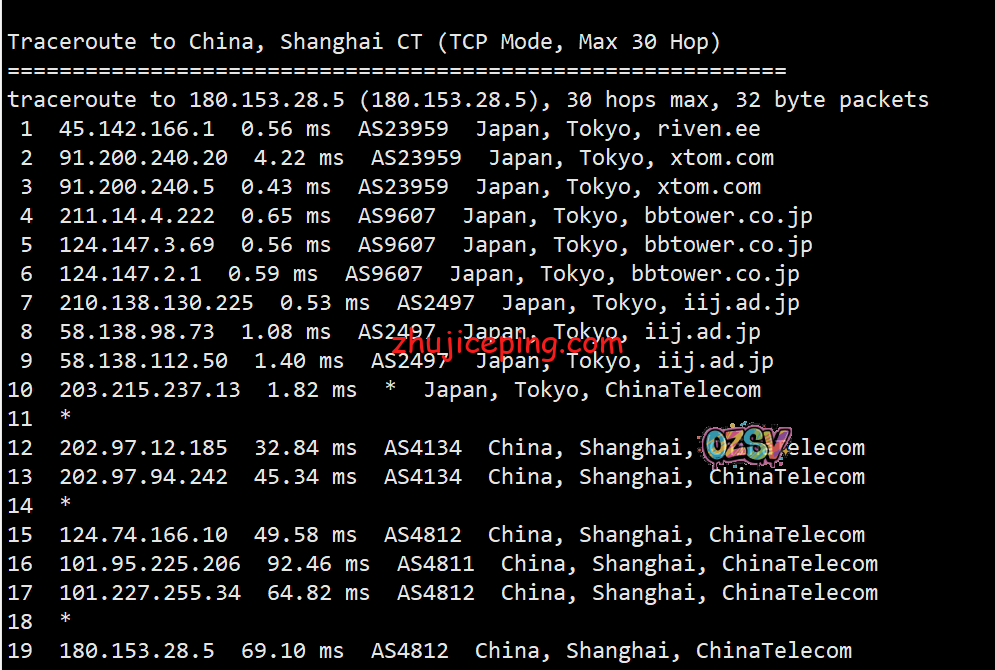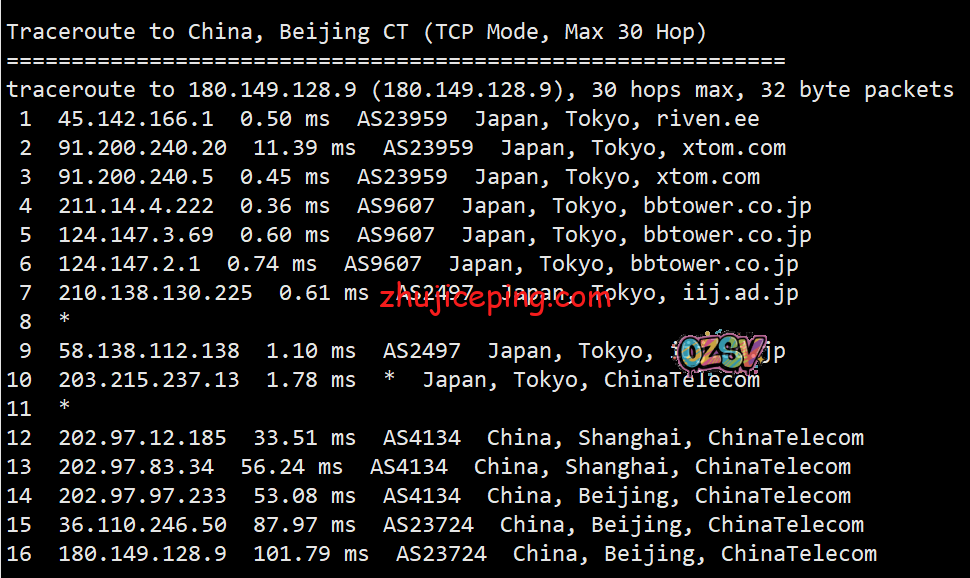 回程,到国内电信:看起来用的XTOM的机器或者是网络,从bbtower后接日本IIJ再到电信日本东京节点后直连回国