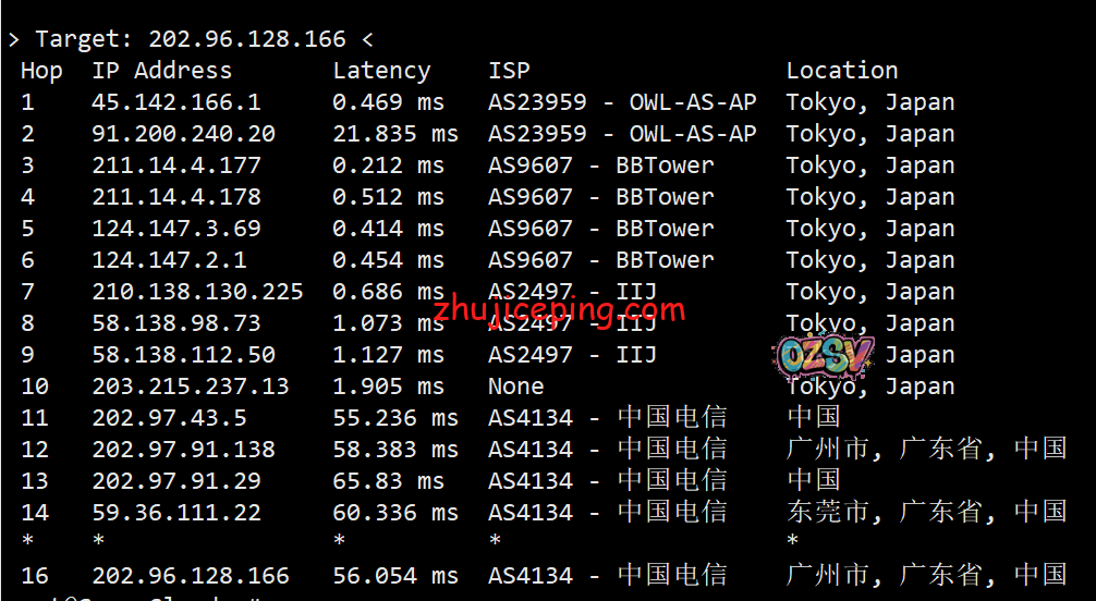 电信去程,骨干网走IIJ后到达日本bbtower机房: